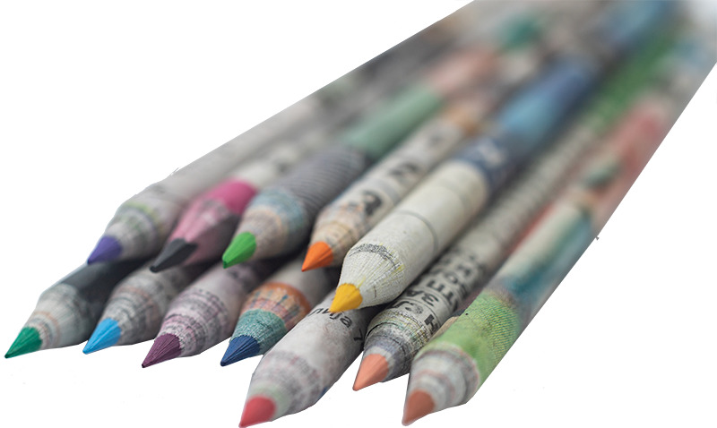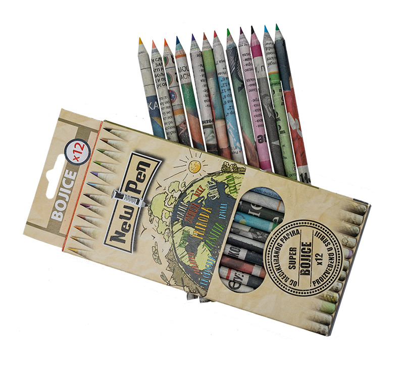 Pakovanje od 12 ručno pravljenih bojica od starih novina. 12 različitrih boja. U skladu sa EN 71. Bojice su okruglog oblika dužine 117mm±0,5mm i debljine 7mm±0,05mm. Kartonsko pakovanje štampano na recikliranom kartonu. Zastupljene boje: žuta, flash, narandžasta, crvena, svetlo ljubičasta, ljubičasta, svetlo plava, plava, svetlo zelena, zelena, braon i crna.