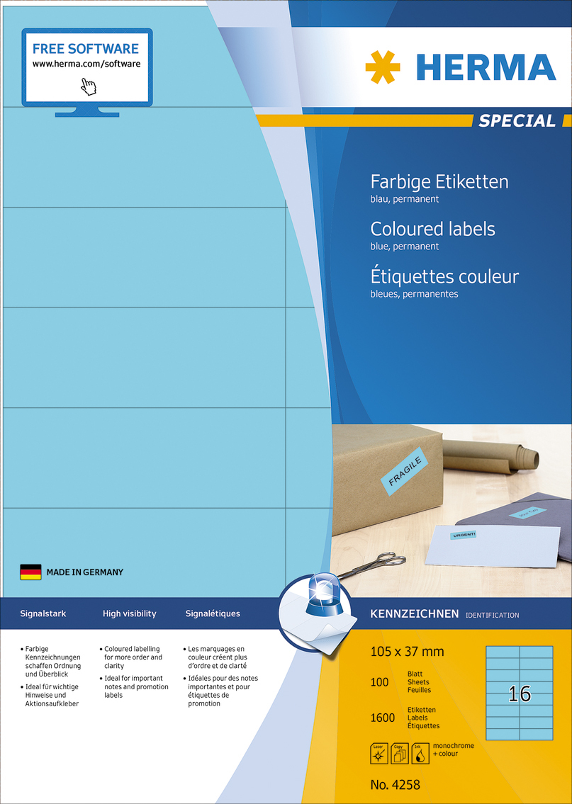 Etikete u boji na A4 listovima, samolepljive. Idealno za oznake sa signalnim karakterom, npr. B. Obaveštenja o upozorenjima, ekspresne napomene, promene adresa, kodiranje boja, promocije, ... Ekološki prihvatljiv: FSC® Mik Credit sertifikovan papir za etikete, beljen bez hlora, lepak bez rastvarača. Etikete se mogu 100% reciklirati sa otpadnim papirom, ambalažom od recikliranog kartona. Veoma dobri rezultati štampe na svim laserskim i inkjet štampačima, fotokopir aparatima, laserskim štampačima u boji i fotokopir mašinama. Besplatna softverska rešenja: vvv.herma.de/softvare.
