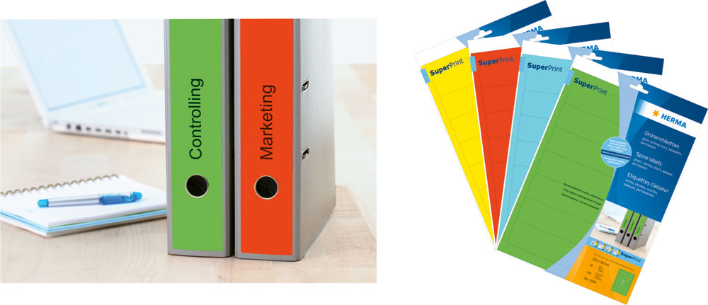 Etikete za registratore na A4 listovima, samolepljive. Za ujednačen izgled u kancelariji i kod kuće. Pogodno za sve uobičajene registratore. Potpuno neproziran materijal sa visokim stepenom beline. Idealne za logotip kompanije, natpise i regulatorne napomene. Bezbedno prijanjaju, čak i uz čestu upotrebu registratora. Ekološki prihvatljive: visokokvalitetni specijalni izbeljeni papir bez hlora, lepak bez rastvarača sa sertifikatom FSC® Mik Credit. Etikete se mogu 100% reciklirati sa otpadnim papirom, ambalažom od recikliranog kartona. Veoma dobri rezultati štampe na svim laserskim i inkjet štampačima, fotokopir aparatima, laserskim štampačima u boji i fotokopir mašinama. Besplatna softverska rešenja: vvv.herma.de/softvare.
