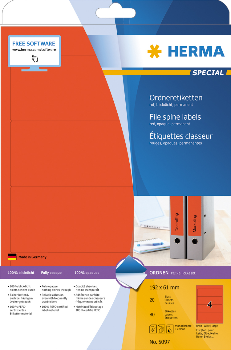 Kod etiketa za registratore HERMA ispunjava svaku želju potrošača sa različitim karaktreristikama prijanjanja u svim formatima koji su u upotrebi, u puno boja. Potpuno neprovidne. Sigurno prijanjaju i kod intenzivnog korišćenja registratora. Idealne za oznaku firme, opise i napomene.