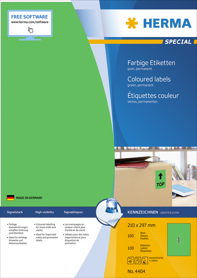 Etikete u boji na A4 listovima, samolepljive. Idealno za oznake sa signalnim karakterom, npr. B. Obaveštenja o upozorenjima, ekspresne napomene, promene adresa, kodiranje boja, promocije, ... Ekološki prihvatljiv: FSC® Mik Credit sertifikovan papir za etikete, beljen bez hlora, lepak bez rastvarača. Etikete se mogu 100% reciklirati sa otpadnim papirom, ambalažom od recikliranog kartona. Veoma dobri rezultati štampe na svim laserskim i inkjet štampačima, fotokopir aparatima, laserskim štampačima u boji i fotokopir mašinama. Besplatna softverska rešenja: vvv.herma.de/softvare.