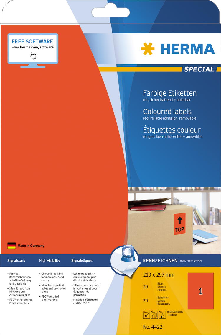 Etikete u boji na A4 listovima, samolepljive. Idealno za oznake sa signalnim karakterom, npr. B. Obaveštenja o upozorenjima, ekspresne napomene, promene adresa, kodiranje boja, promocije, ... Ekološki prihvatljiv: FSC® Mik Credit sertifikovan papir za etikete, beljen bez hlora, lepak bez rastvarača. Etikete se mogu 100% reciklirati sa otpadnim papirom, ambalažom od recikliranog kartona. Veoma dobri rezultati štampe na svim laserskim i inkjet štampačima, fotokopir aparatima, laserskim štampačima u boji i fotokopir mašinama. Besplatna softverska rešenja: vvv.herma.de/softvare.