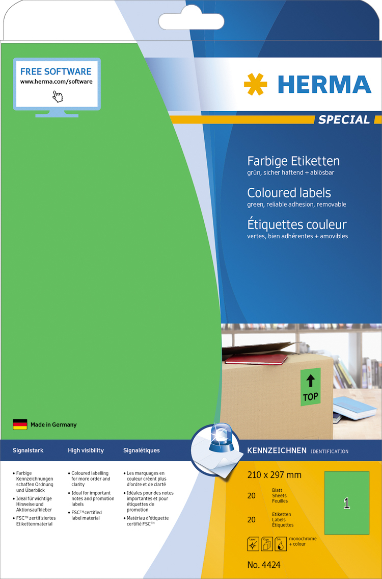 Etikete u boji na A4 listovima, samolepljive. Idealno za oznake sa signalnim karakterom, npr. B. Obaveštenja o upozorenjima, ekspresne napomene, promene adresa, kodiranje boja, promocije, ... Ekološki prihvatljiv: FSC® Mik Credit sertifikovan papir za etikete, beljen bez hlora, lepak bez rastvarača. Etikete se mogu 100% reciklirati sa otpadnim papirom, ambalažom od recikliranog kartona. Veoma dobri rezultati štampe na svim laserskim i inkjet štampačima, fotokopir aparatima, laserskim štampačima u boji i fotokopir mašinama. Besplatna softverska rešenja: vvv.herma.de/softvare.
