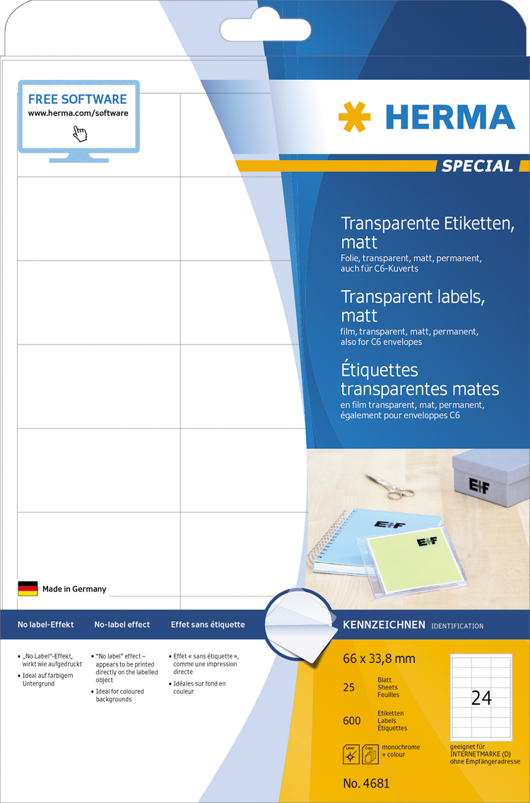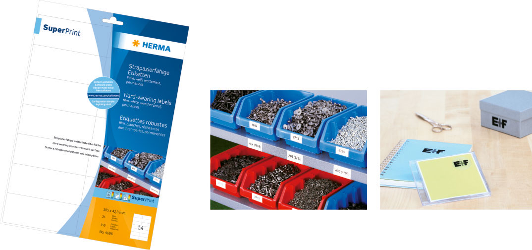 Providne etikete na A4 listovima, samolepljive. Savršene za vizuelno zahtevne aplikacije, idealne za obojene površine, staklo, porcelan, za reprezentativne dokumente, ažuriranja ili za adresiranje. Bez efekta etikete: natpisi izgledaju kao da se štampaju direktno. Otporne na vremenske uslove, ne starenje, odbijaju ulje i prljavštinu, može se prati. Za laserske štampače i fotokopir mašine, laserske štampače u boji i fotokopir aparate u boji. Nijsu pogodne za inkjet štampače. Besplatna softverska rešenja: vvv.herma.de/softvare.