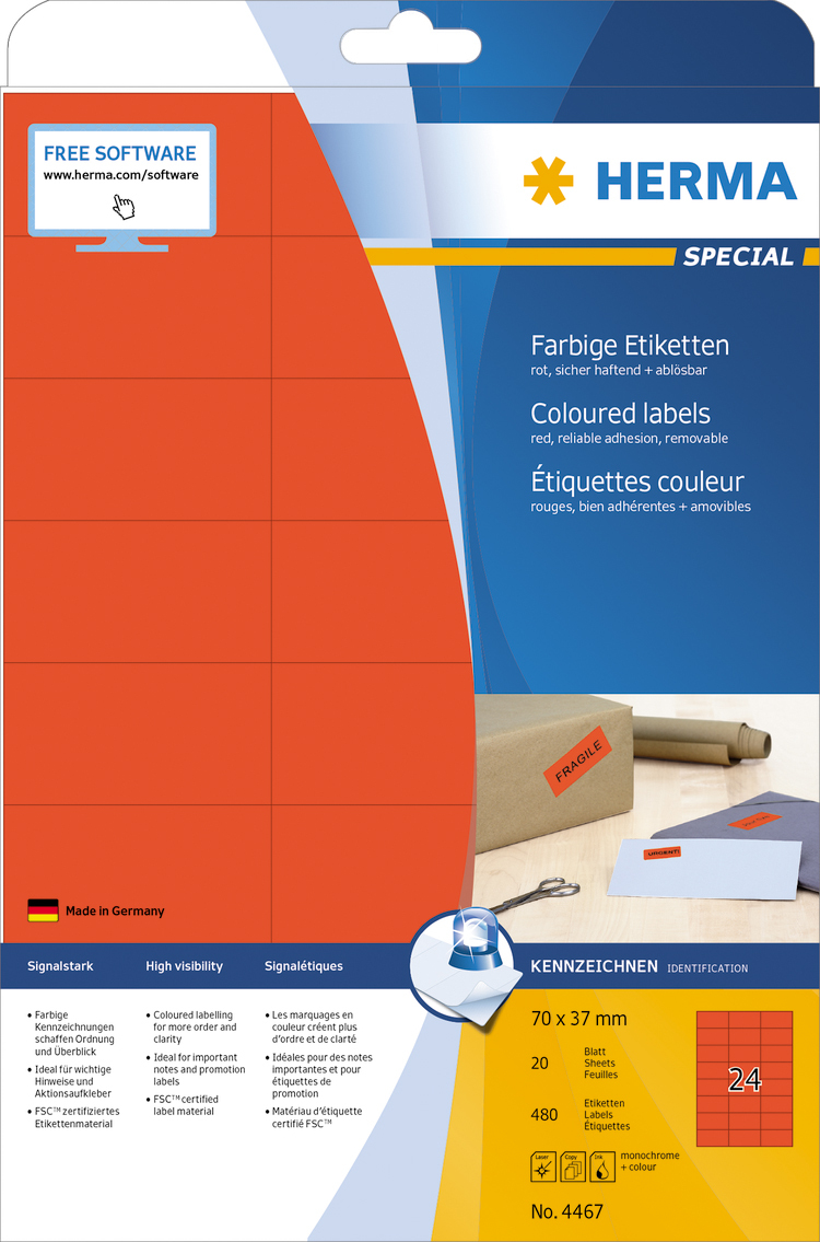 Etikete u boji na A4 listovima, samolepljive. Idealno za oznake sa signalnim karakterom, npr. B. Obaveštenja o upozorenjima, ekspresne napomene, promene adresa, kodiranje boja, promocije, ... Ekološki prihvatljiv: FSC® Mik Credit sertifikovan papir za etikete, beljen bez hlora, lepak bez rastvarača. Etikete se mogu 100% reciklirati sa otpadnim papirom, ambalažom od recikliranog kartona. Veoma dobri rezultati štampe na svim laserskim i inkjet štampačima, fotokopir aparatima, laserskim štampačima u boji i fotokopir mašinama. Besplatna softverska rešenja: vvv.herma.de/softvare.