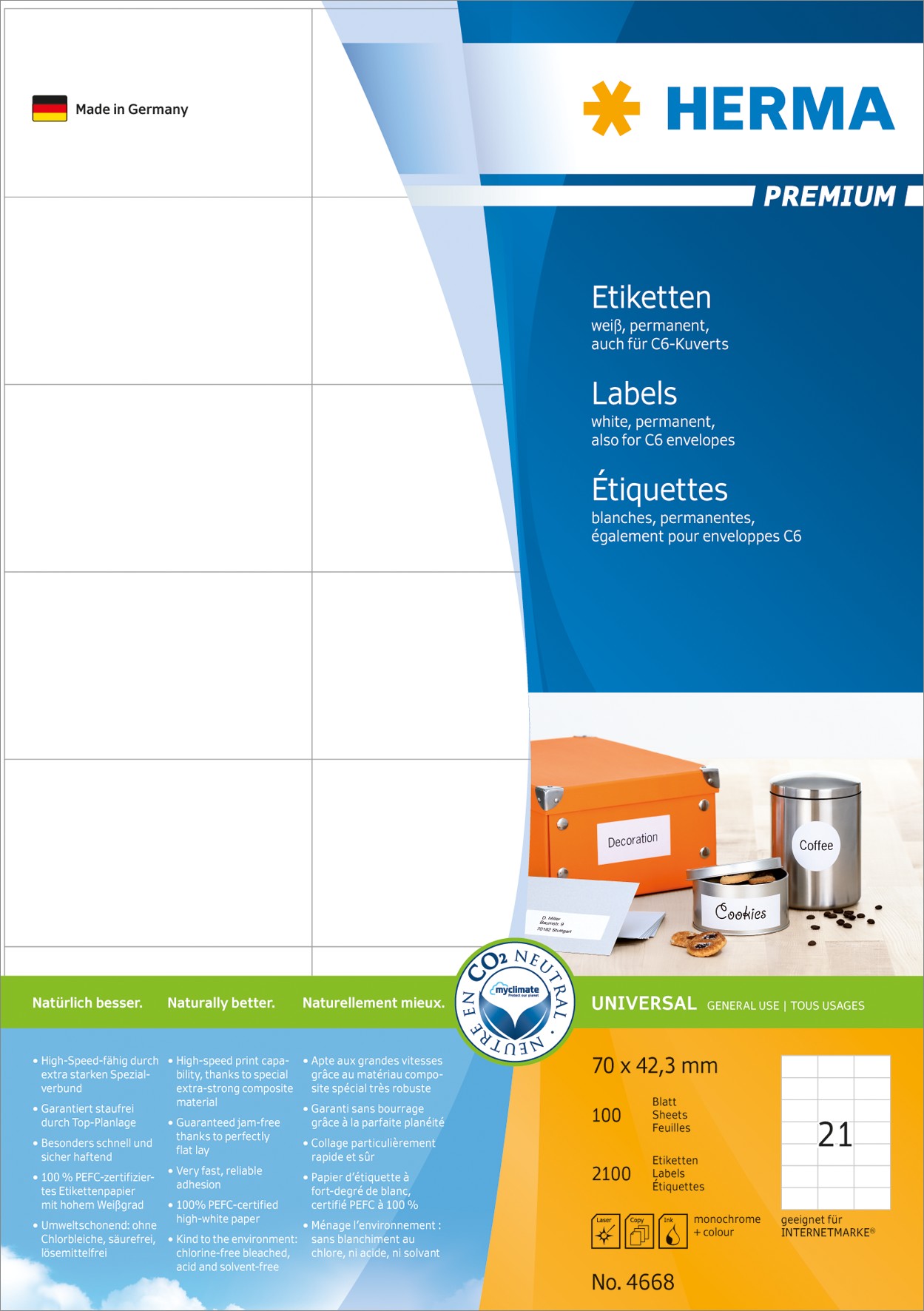 Samolepljive etikete na A4 listovima, trajno lepljenje. Savršeno za sve laserske i inkjet štampače, kopir mašine, laserske štampače u boji i fotokopir mašine u boji. Garantovano bez zaglavljivanja i na štampačima velike brzine, zahvaljujući izuzetno jakoj specijalnoj mešavini, vrhunskoj ravnosti i svestranoj sigurnosnoj ivici. Visok stepen beline i ravna površina za najbolje štampanje, izuzetno jake etikete, lako se lepe. Prijanja naročito brzo i sigurno, čak i na hladnim i vlažnim površinama. Ekološki prihvatljiv i održiv: izbeljen bez hlora, FSC® Mik Credit sertifikovan lepak bez rastvarača. Etikete se mogu 100% reciklirati sa otpadnim papirom, ambalažom od recikliranog kartona. Besplatna softverska rešenja: vvv.herma.de/softvare.