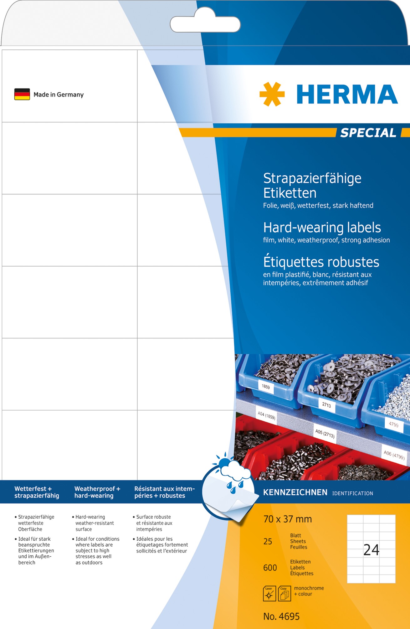 Etikete od bele mat folije na A4 listovima, samolepljive. Idealno za etiketiranje koje se često koristi i na otvorenom: etikete za imovinu, nalepnice za izloge, natpisi sa informacijama i upozorenjima, oznake u skladištima i proizvodnim objektima. Izdržljiva površina otporna na vremenske uslove, posebno jaka, otporna na UV zračenje i starenje, otporna na ulje i prljavštinu, periva, otporna na temperaturu od -30 do +80 °C, otporna na morsku vodu. Za laserske štampače i fotokopir mašine, laserske štampače u boji i fotokopir aparate u boji. Nije pogodno za inkjet štampače. Besplatna softverska rešenja: vvv.herma.de/softvare.