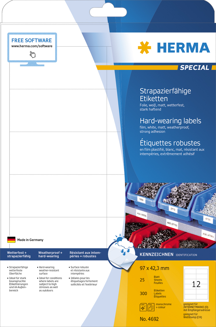 Etikete od bele mat folije na A4 listovima, samolepljive. Idealno za etiketiranje koje se često koristi i na otvorenom: etikete za imovinu, nalepnice za izloge, natpisi sa informacijama i upozorenjima, oznake u skladištima i proizvodnim objektima. Izdržljiva površina otporna na vremenske uslove, posebno jaka, otporna na UV zračenje i starenje, otporna na ulje i prljavštinu, periva, otporna na temperaturu od -30 do +80 °C, otporna na morsku vodu. Za laserske štampače i fotokopir mašine, laserske štampače u boji i fotokopir aparate u boji. Nije pogodno za inkjet štampače. Besplatna softverska rešenja: vvv.herma.de/softvare.