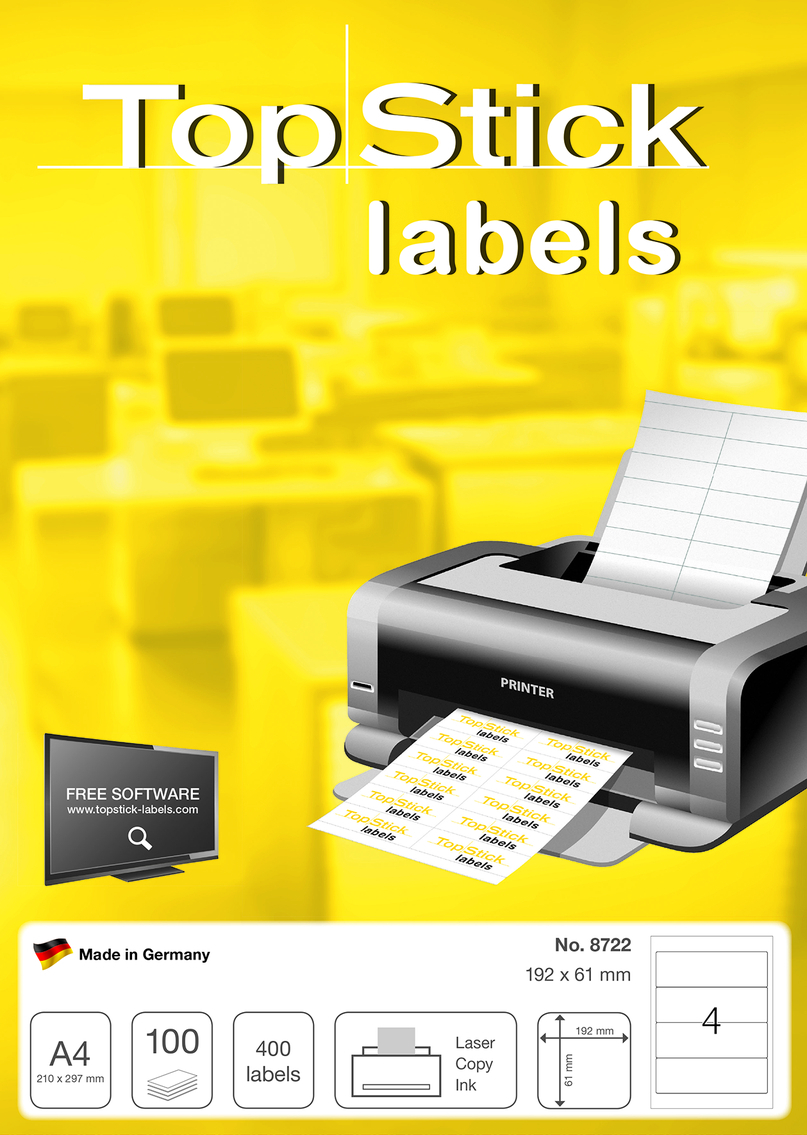 Samolepljive, trajno lepljive etikete na A4 listovima. Za sve laserske, inkjet štampače i kopir mašine ili za ručni ispis. Precizno sečena i sveobuhvatna sigurnosna ivica štite bubanj štampača i valjke od ostataka lepka. Napravljene od beljenog papira bez hlora sa FSC® sertifikatom (FSC-C110972). Primenjen lepak bez isparljivih supstanci. Idealno za etiketiranje ili označavanje proizvoda, za adresiranje i slanje, organizovanje i arhiviranje.