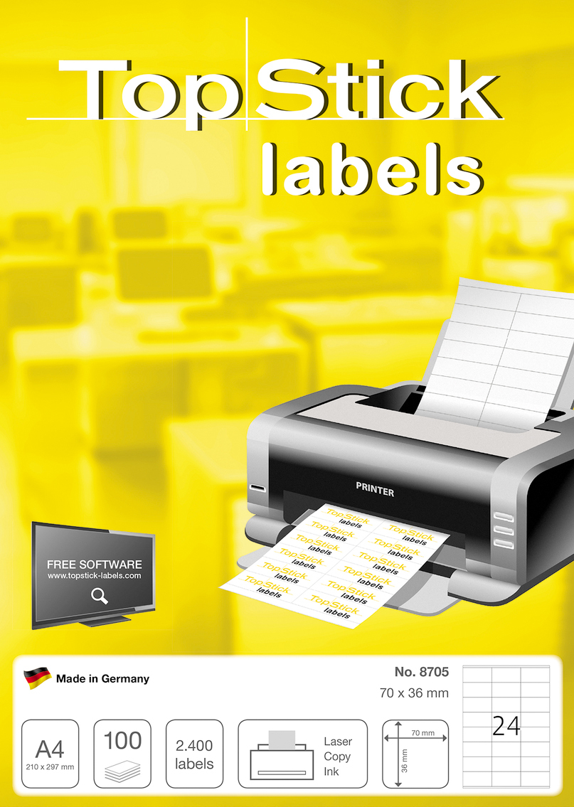 Samolepljive, trajno lepljive etikete na A4 listovima. Za sve laserske, inkjet štampače i kopir mašine ili za ručni ispis. Precizno sečena i sveobuhvatna sigurnosna ivica štite bubanj štampača i valjke od ostataka lepka. Napravljene od beljenog papira bez hlora sa FSC® sertifikatom (FSC-C110972). Primenjen lepak bez isparljivih supstanci. Idealno za etiketiranje ili označavanje proizvoda, za adresiranje i slanje, organizovanje i arhiviranje.