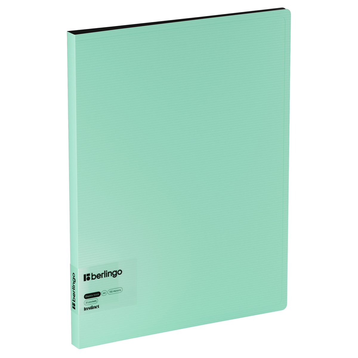 Fascikla Berlingo Instinct A4 sa 20 folija, širina 17mm, debljina materijala 700 mikrona. Unutrašnje folije su debljine 30 mikrona. sigurno su pričvršćene zavarivanjem. Spoljašnja korica je mint boje, a unutrašnja je crne boje, sa providnim džepom za dodatne dokumente.