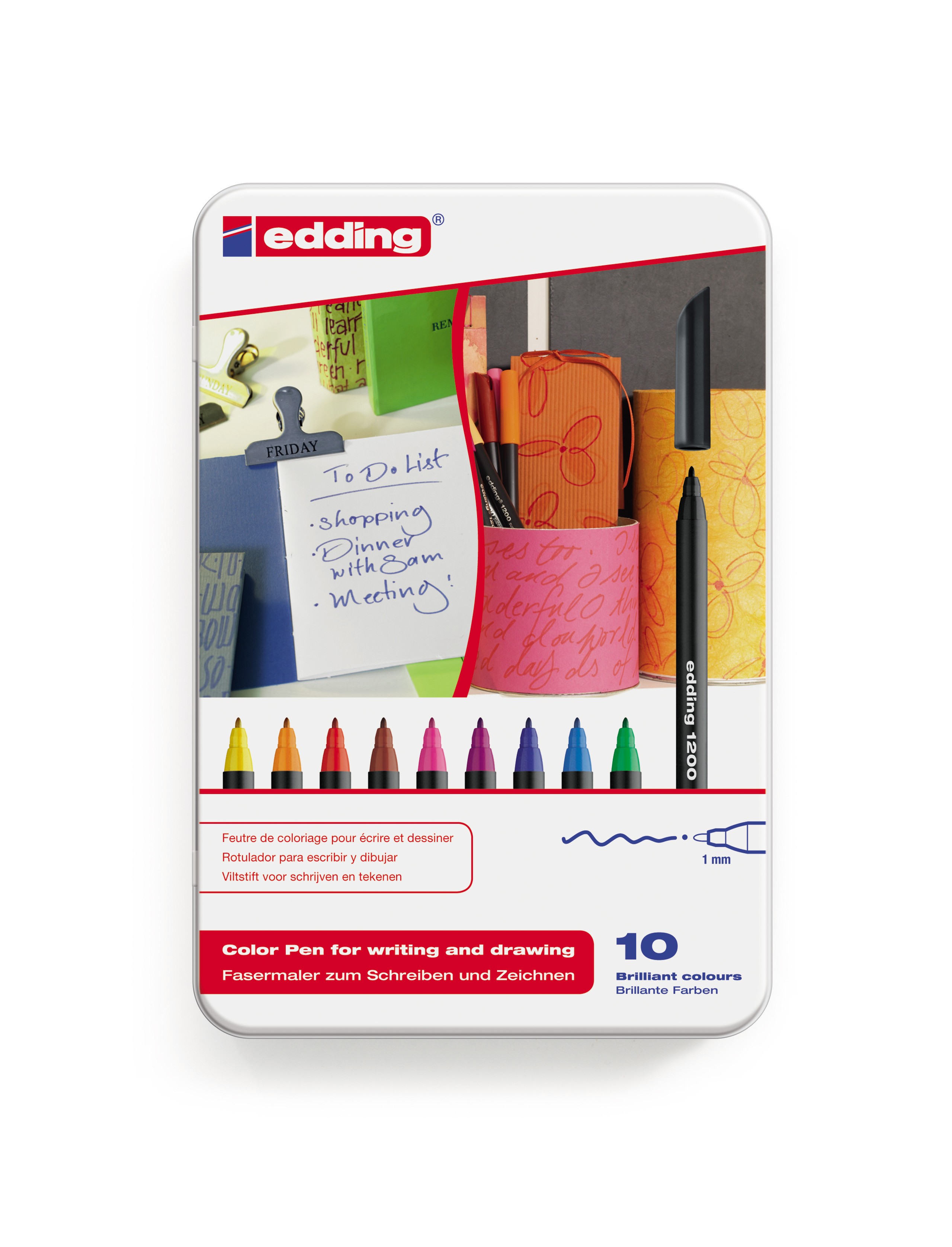 Flomasteri od vlakana sa finim vrhom. Širina linije 1 mm za pisanje, skiciranje i grafički dizajn na obojenom, svetlom papiru. Pogodno za pisanje čestitki, razglednica ili čak beleški. Dostupan u 30 živih, briljantnih boja, u rasponu od delikatnih pastelnih do intenzivnog sjaja. Raznovrsne boje sa kojima svaka ideja može biti živopisno izvedena. Mastilo na bazi vode ima visoku pokrivenost i ne probija papir. Mastilo otporno na svetlost obezbeđuje dugotrajne, kreativne rezultate u školi, kod kuće ili u kancelariji. robustni, visokokvalitetni vrh obezbeđuje ravnomerno nanošenje mastila i sprečava habanje i razmazivanje mastila. Idealan je za crtanje finih linija kao i za bojenje površina. Takođe dostupan sa svetlucavim metalik efektom (edding 1200 metalik) i kao Flomasteri za četkicu sa fleksibilnim vrhom (edding 1340 brush pen) Visokokvalitetni brendirani proizvod. Proizvedeno u Nemačkoj.
