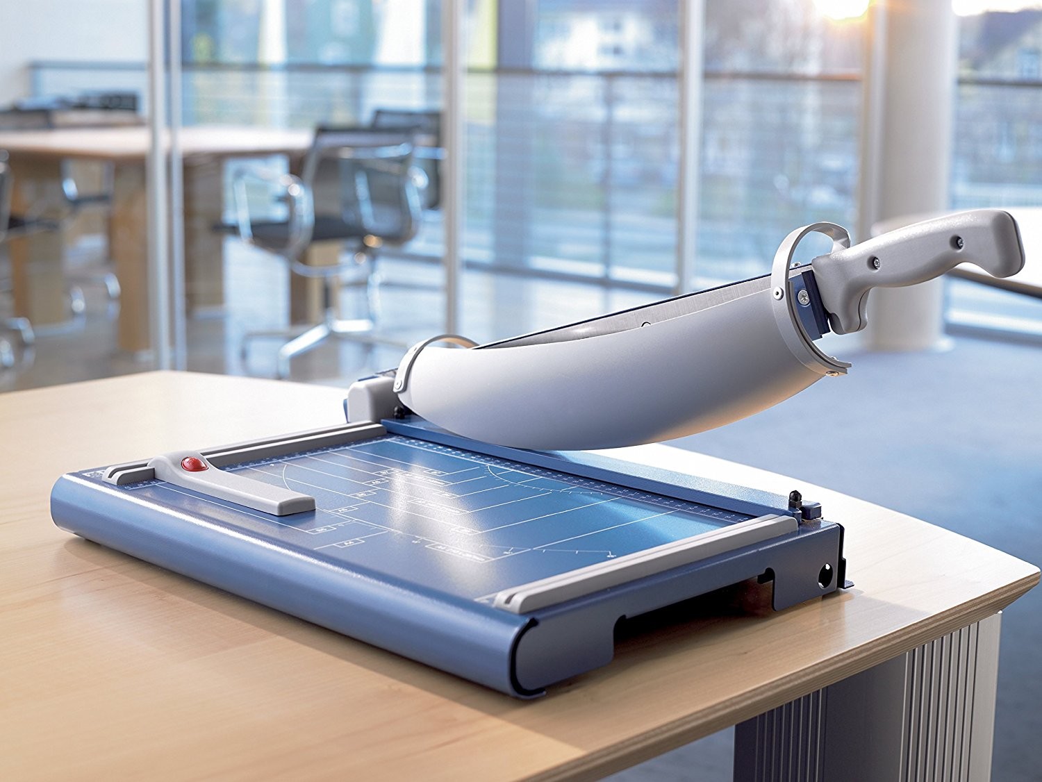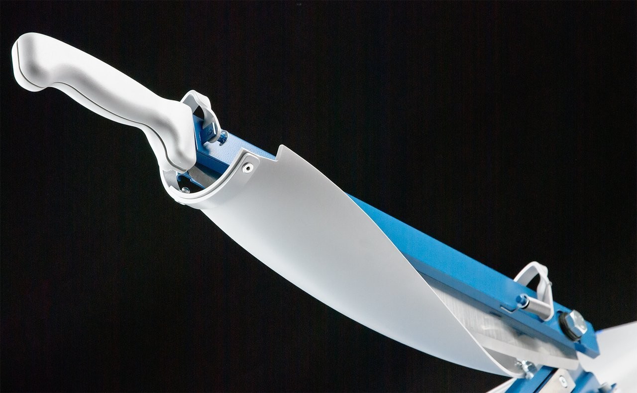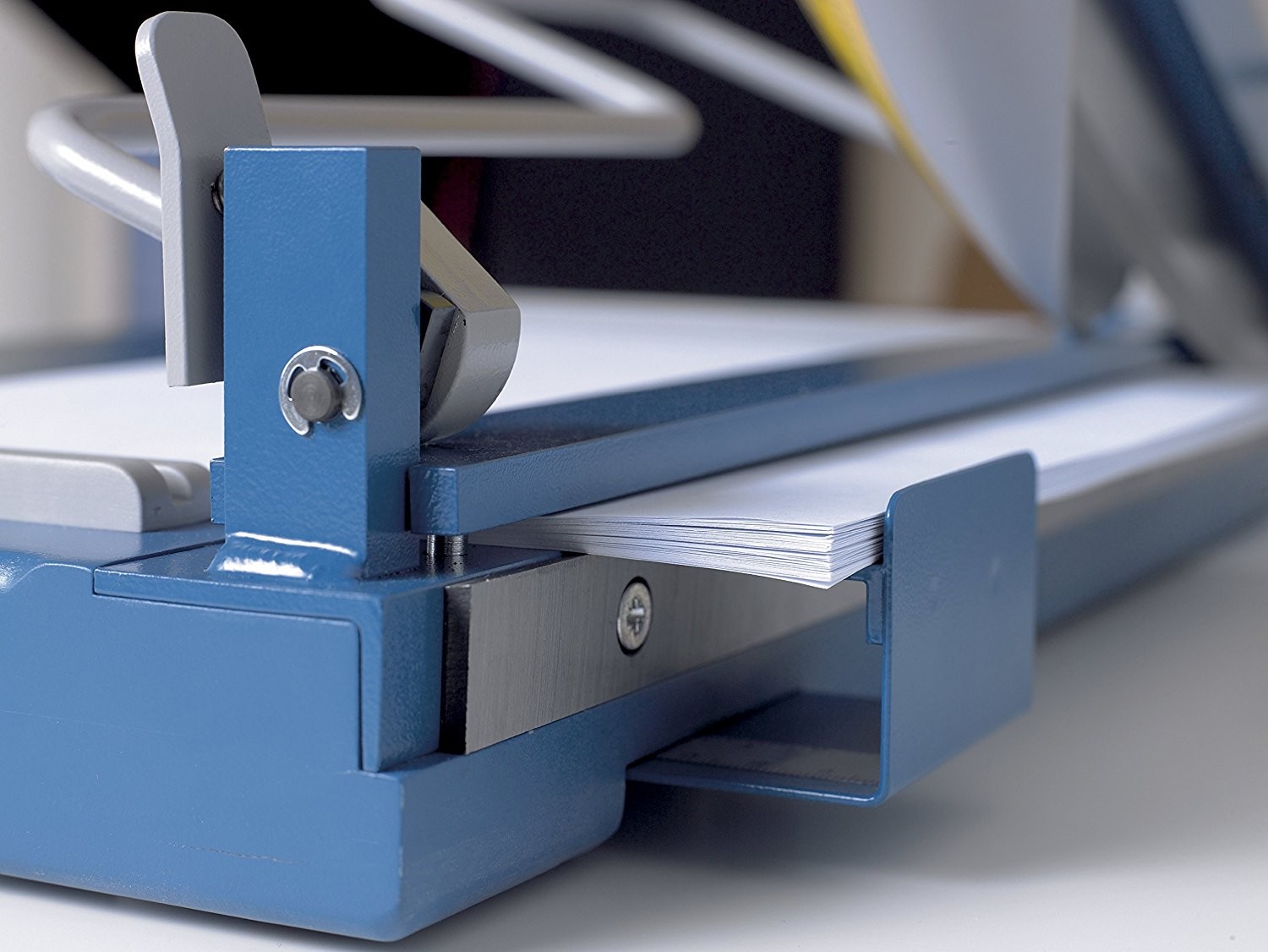 Profesionalna stona giljotina za papir. Gornja i donja oštrica od brušenog kvalitetnog Solingen čelika. Metalna radna površina sa uglovima i oznakama u centimetrima i inčima. Graničnik za materijal. Ugrađena posebna bezbednosna obloga.