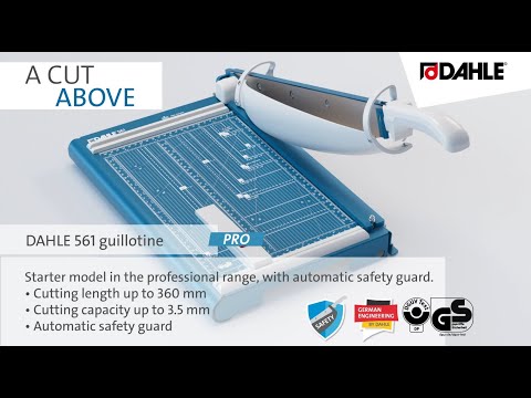 Profesionalna stona giljotina za papir. Gornja i donja oštrica od brušenog kvalitetnog Solingen čelika. Metalna radna površina sa uglovima i oznakama u centimetrima i inčima. Graničnik za materijal. Ugrađena posebna bezbednosna obloga.