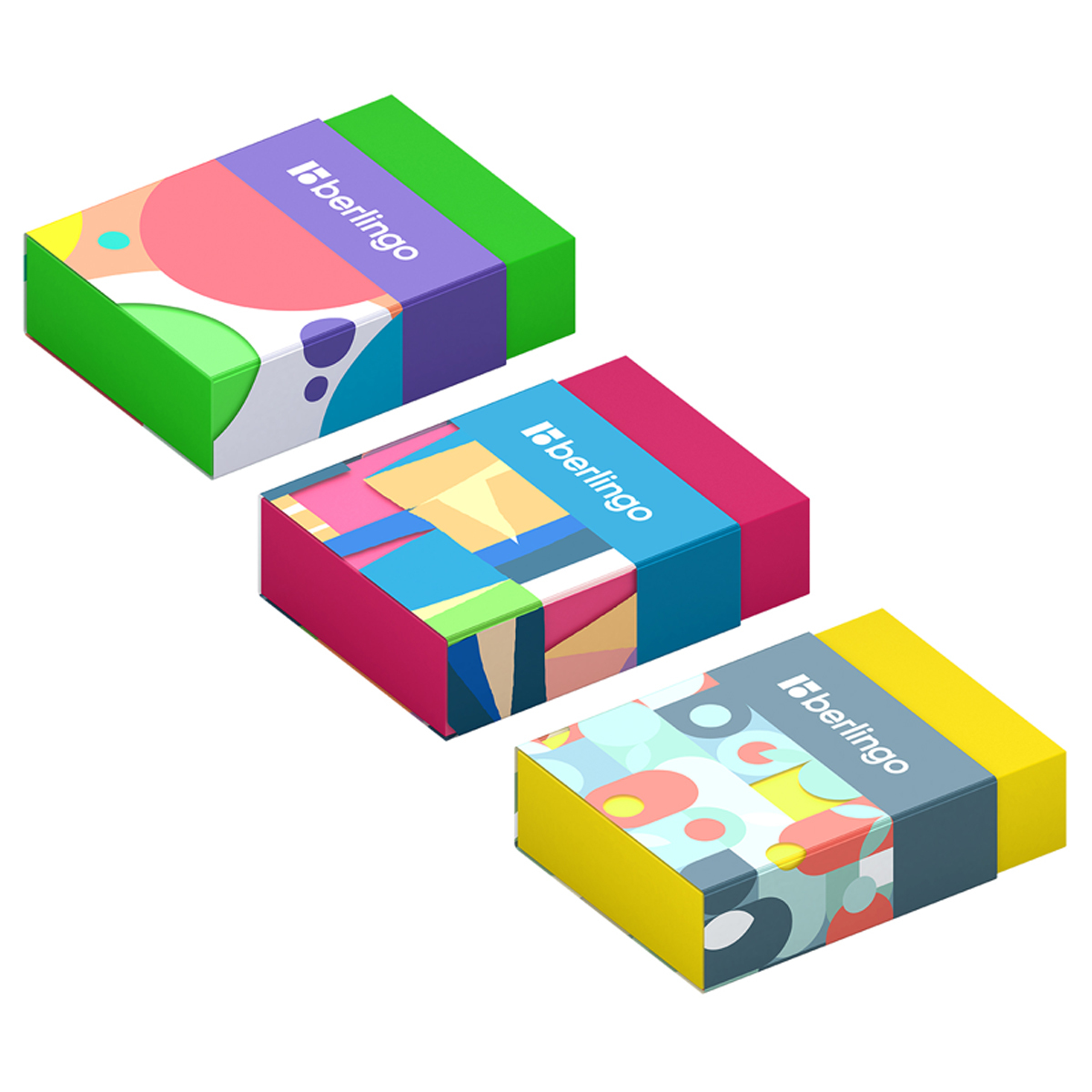 Školska gumica u jarkim bojama sa omotom. Kartonsko pakovanje dozvoljava praktično izlaganje.