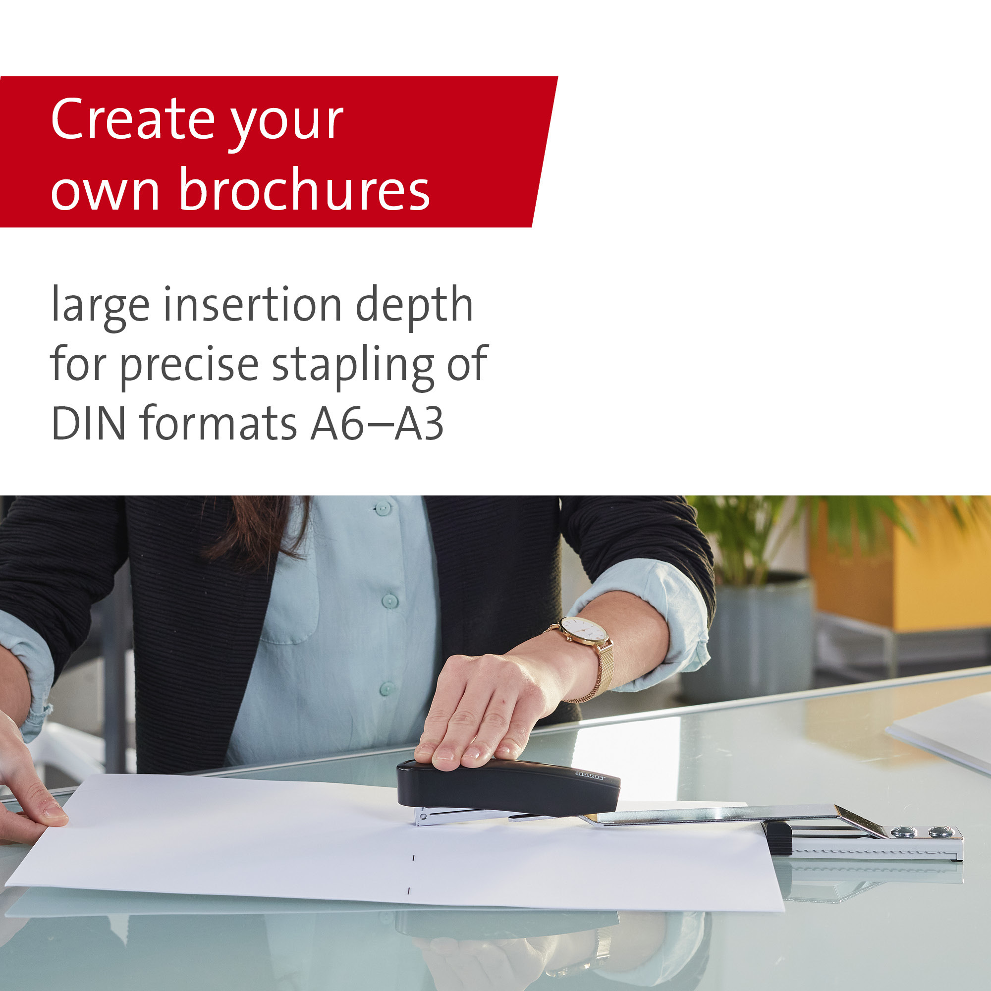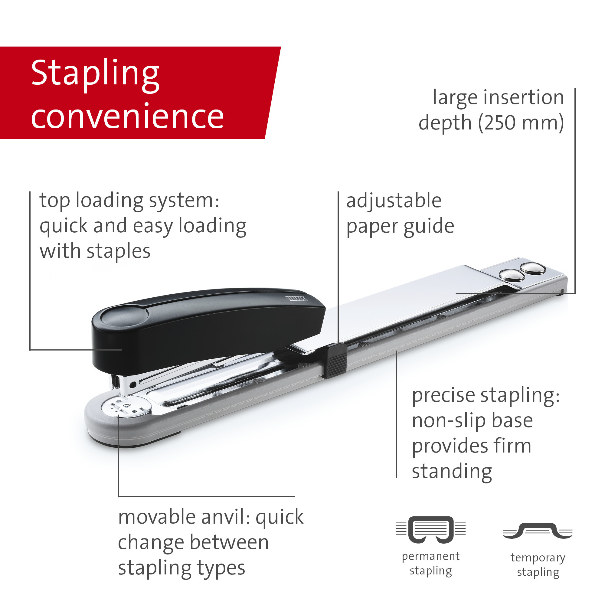 Profesionalna heftalica za povezivanje u knjižni blok. Dubina heftanja 250mm. Koristi klamerice 24/6 i 26/6. Garancija 10 godina.