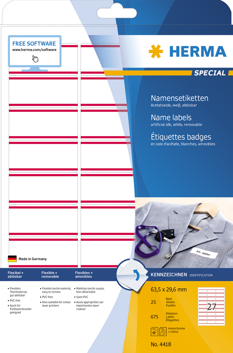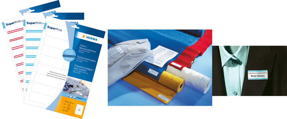 Izrađene od tekstila, sigurno prijanjaju i jednostavno se uklanjaju. Idealne za seminare, konferencije, sajmove ili za označavanje proizvoda od tekstila. Nisu za upotrebu na osetljivim materijalima. Za laserske štampače i fotokopire.
