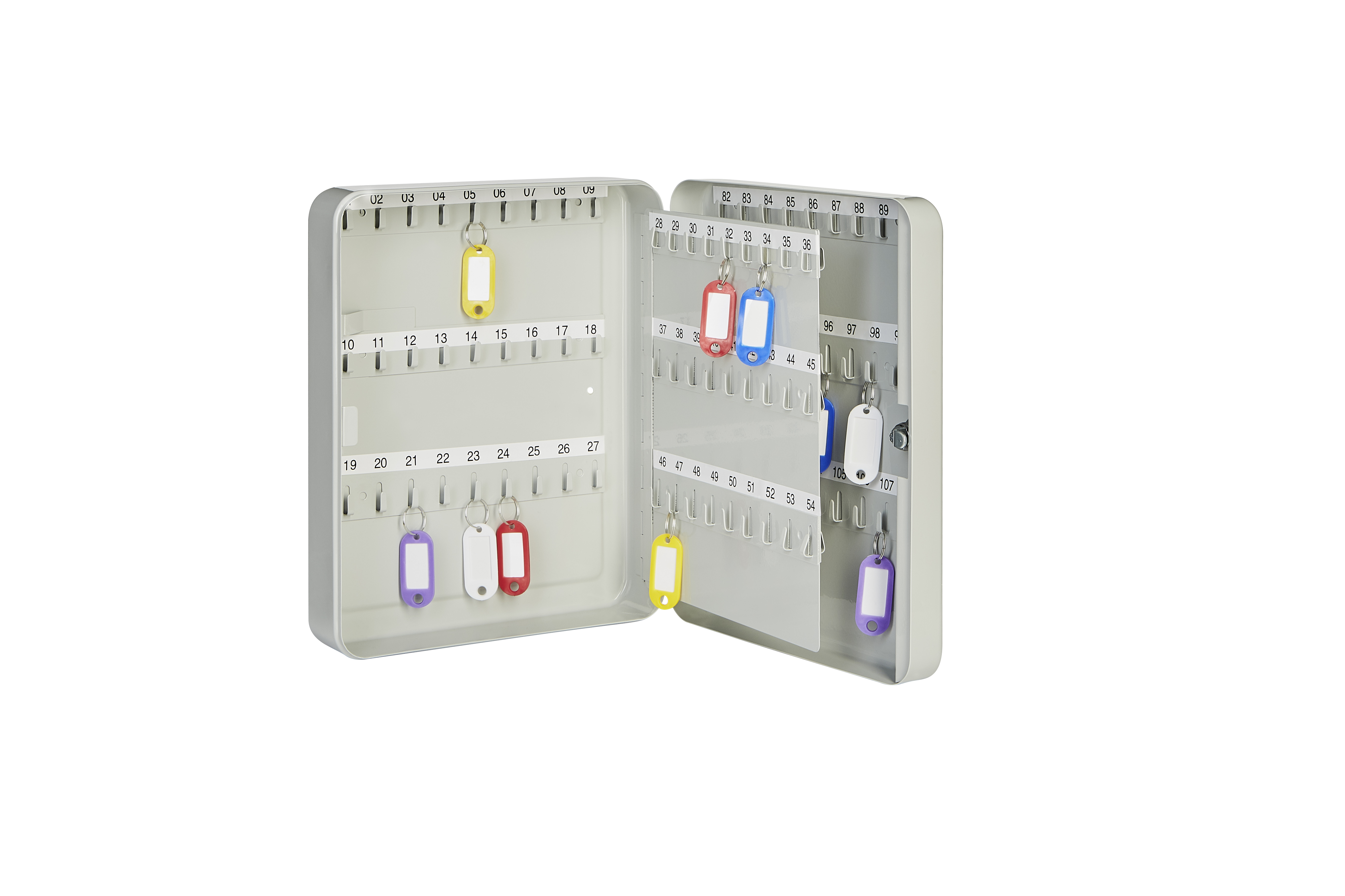 Kasete za ključeve izrađene od lakiranog čeličnog lima. Uz svaku kasetu se dobijaju dva ključa. Kukice za kačenje ključeva su numerisane. Za 108 ključeva.
