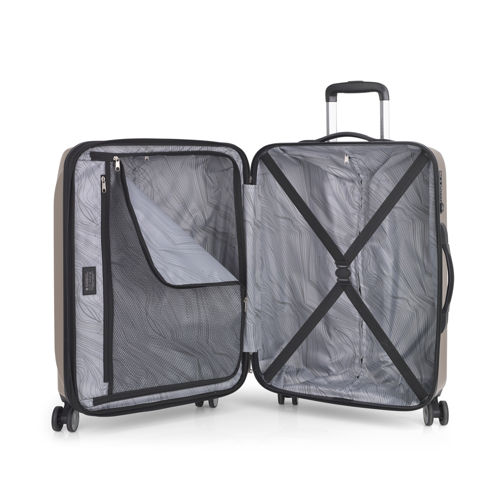 Srednji kofer idealan je za duža putovanja jer je balans izmedju prostora, funkcionalnosti i modernog dizajna. Izradjen od ABS materijala čini ga otpornim na udarce i oštećenja i habanje. Ima proširivi dizajn koji omogućava povećanje kapaciteta po potrebi, čime nudi prostor za prtljag i omogućava lakše pakovanje. 4 točka omogućavaju lako manevrisanje u svim pravcima a samim tim i lakše kretanje. Teleskopksa ručka sa podesivom visinom je udobna za rukovanje i ima i bočne rukohvate koji olakšavaju podizanje kofera. Ima pouzdan rajsferšlus sa opcijom zaključavanja u ugradjenu TSA bravu koja pruža dodatnu zaštitu. Prostrana unutrašnjost je opremnjena trakama za osiguranje odeće i ima dodatne džepove za bolju organizaciju. Kofer je funkcionalan, prostran i sa dodatnim kapacitetom i pouzdanim karateristikama je veoma udoban i siguran za putaovanje.