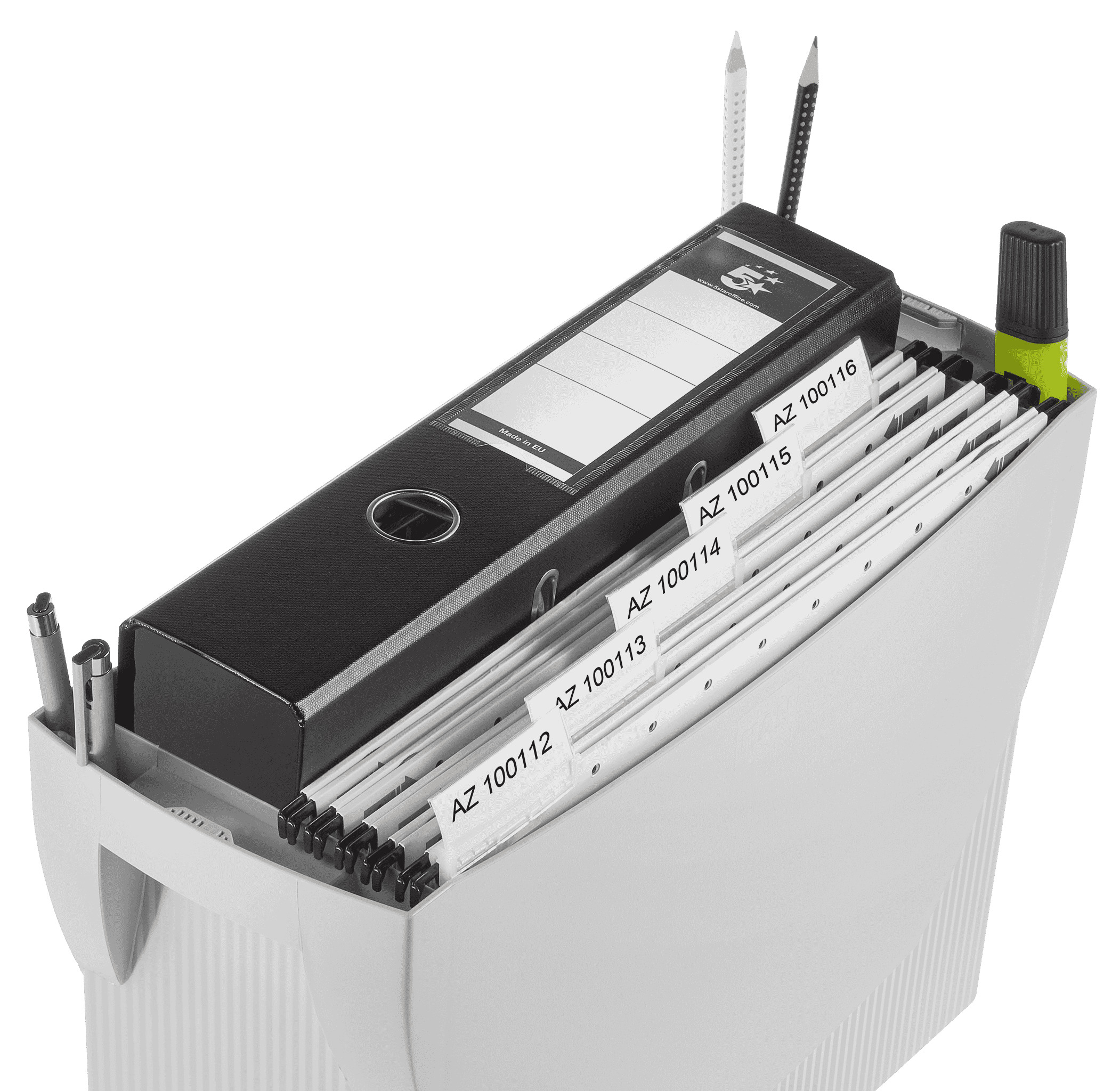 Kutija za viseće fascikle SWING inovativnog dizajna, lagana kao pero, ali čvrsta, jer je izrađena od visokokvalitetne plastike. Laka za rukovanje/premeštanje zahvaljujući dva praktična rukohvata. Pogodna za odlaganje do 20 visećih fascikli.