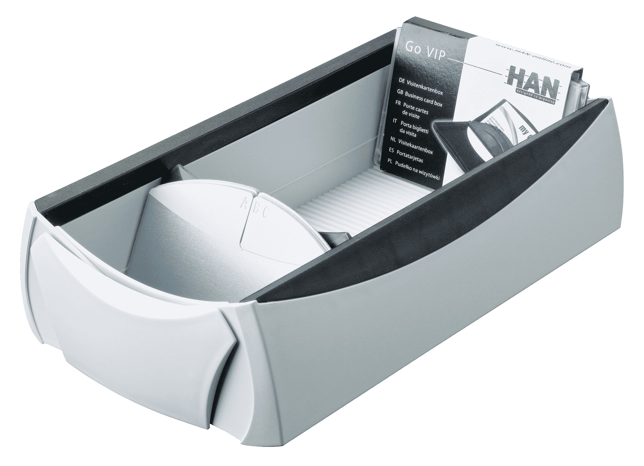 VIP kutija za vizit karte modernog dizajna sa visokokvalitetnom završnom obradom. Mogućnost odlaganja do 500 vizit kartica. Uz kutiju dobijate i jedan Go VIP držač, u koji možete odložiti cca 10 kartica, a koje će uvek biti uz vas dok ste u pokretu. Kutija sadrži i 16 indeksa A-Z za bolje sortiranje, kao i podesivi graničnik, koji možete pomerati po želji.