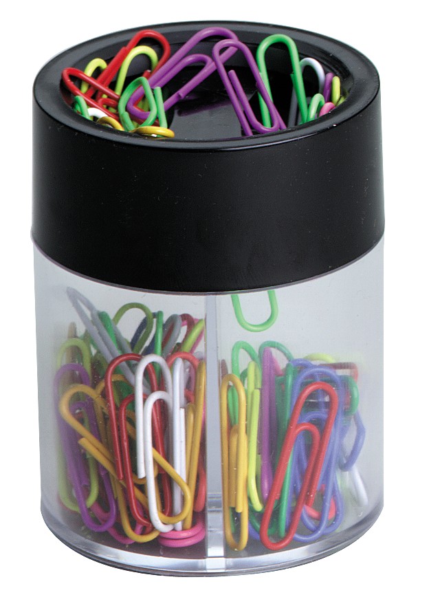 Okrugla magnetna kutija za spajalice sa spajalicama u boji, dimenzije R58 mm x 72 mm.
