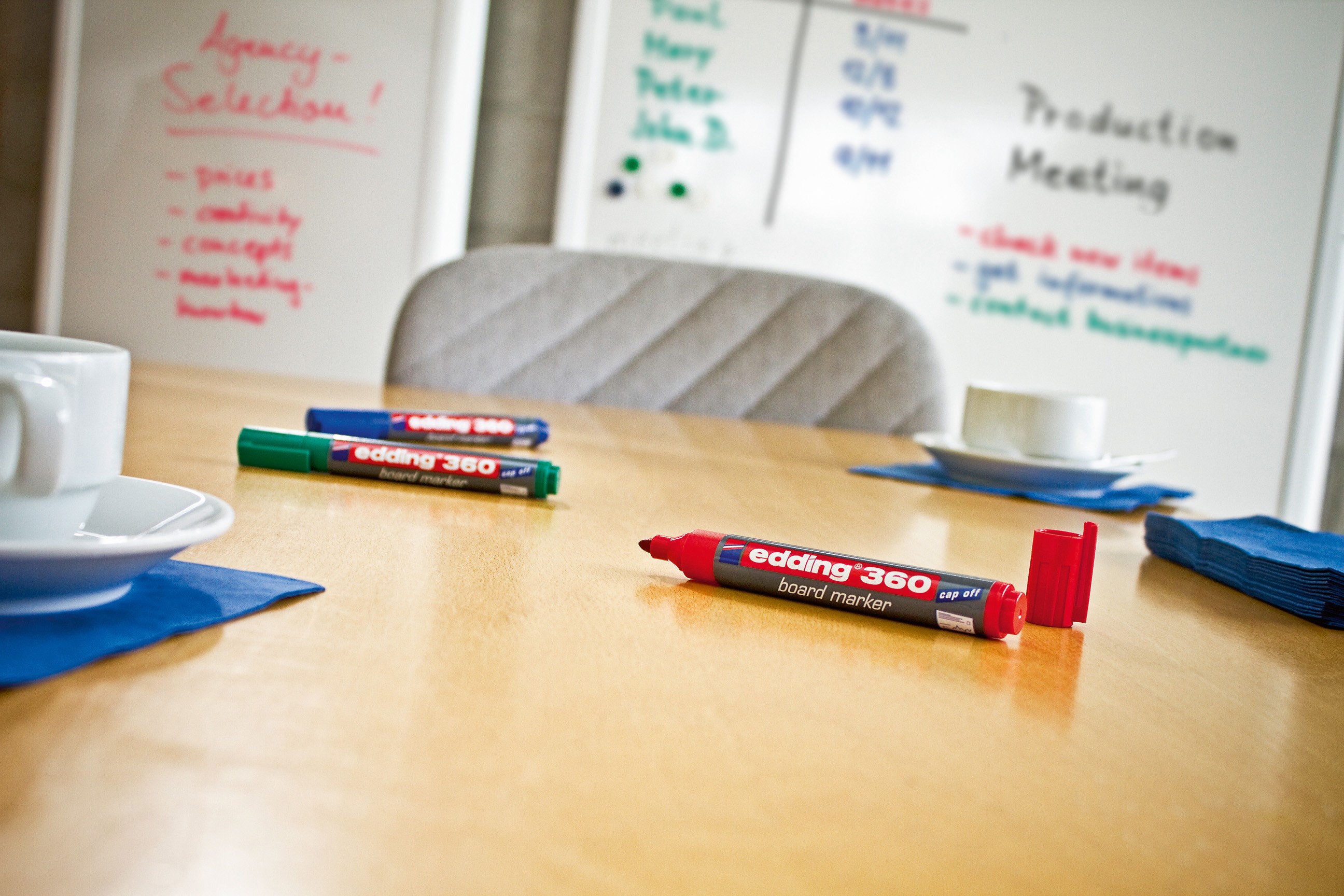 Jedan od najprodavanijih Edding proizvoda u Srbiji, izbor velikog broja učitelja i nastavnika. Odličan i u kancelariji za brzo planiranje zadataka ili za pisane sesije razmišljanja. Pigmentno mastilo slabog mirisa ne sadrži butil acetat i može se obrisati na suvo sa skoro svake neporozne površine, kao što je emajl ili melamin. Boje crna, crvena, plava i zelena mogu se dopuniti pomoću edding BTK 25 mastila za punjenje. Poklopac se može čuvati na kraju cevi. Praktična klipsa sprečava da se kotrlja i može se pričvrstiti na odeću ili druge predmete. Čuvajte horizontalno. Proizvod visokog kvaliteta brenda. Proizvedeno u Nemačkoj.