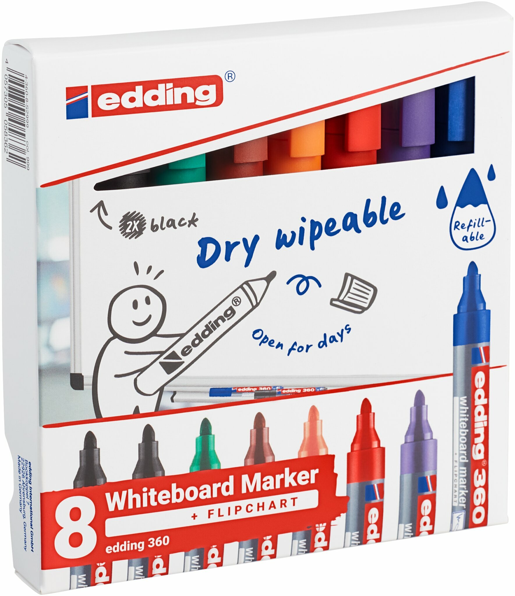 Jedan od najprodavanijih Edding proizvoda u Srbiji, izbor velikog broja učitelja i nastavnika. Odličan i u kancelariji za brzo planiranje zadataka ili za pisane sesije razmišljanja. Pigmentno mastilo slabog mirisa ne sadrži butil acetat i može se obrisati na suvo sa skoro svake neporozne površine, kao što je emajl ili melamin. Boje crna, crvena, plava i zelena mogu se dopuniti pomoću edding BTK 25 mastila za punjenje. Poklopac se može čuvati na kraju cevi. Praktična klipsa sprečava da se kotrlja i može se pričvrstiti na odeću ili druge predmete. Čuvajte horizontalno. Proizvod visokog kvaliteta brenda. Proizvedeno u Nemačkoj.