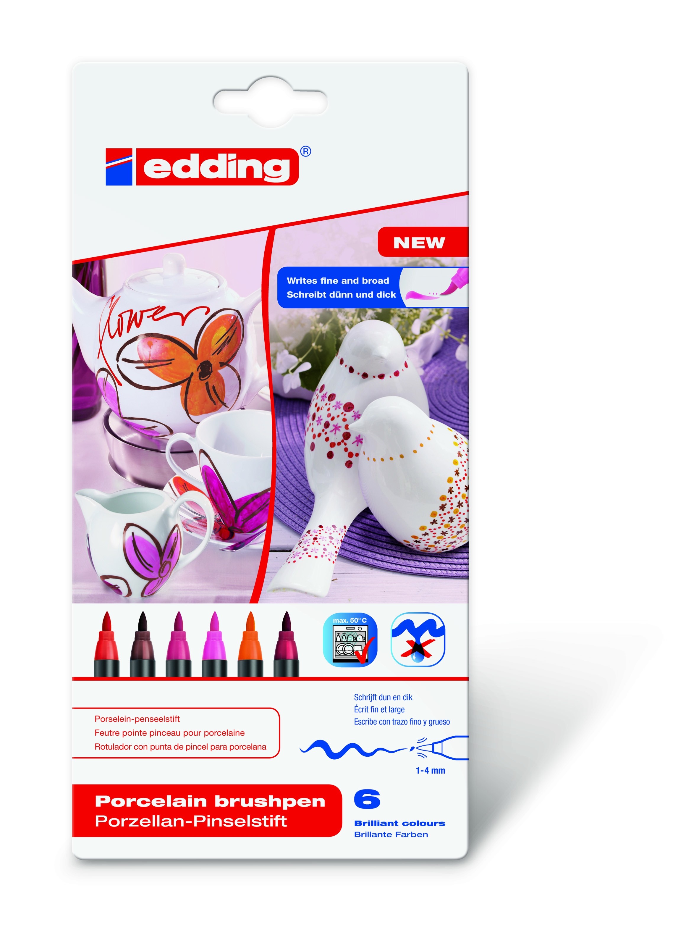 Porcelanska četkica Edding je idealno rešenje za etiketiranje, kreativno ukrašavanje i šareno farbanje keramike i porcelana. Set od 6 različitih boja. Širok spektar boja koje donose radost i omogućavaju da se svaka ideja živopisno ugravira na porcelan, staklo i keramiku. Mastilo na bazi vode bez mirisa se brzo suši i posebno je svetlo. Pre upotrebe pećnice, ukrasi i natpisi se mogu lako ispraviti bez curenja. Visokokvalitetni vrh obezbeđuje ravnomernu distribuciju mastila bez ceđenja i bez kapanja. To ga čini idealnim za početnike, kao i za napredne slikare. Pre farbanja, pažljivo očistite površinualkoholom i uverite se da je površina potpuno bez otisaka prstiju. Zatim ostavite kreativno umetničko delo da se osuši 15 minuta, a zatim ga stavite u rernu na 160 °C na 25 minuta. Zatim ostavite da se ohladi. Visokokvalitetni brendirani proizvod. Proizvedeno u Nemačkoj.