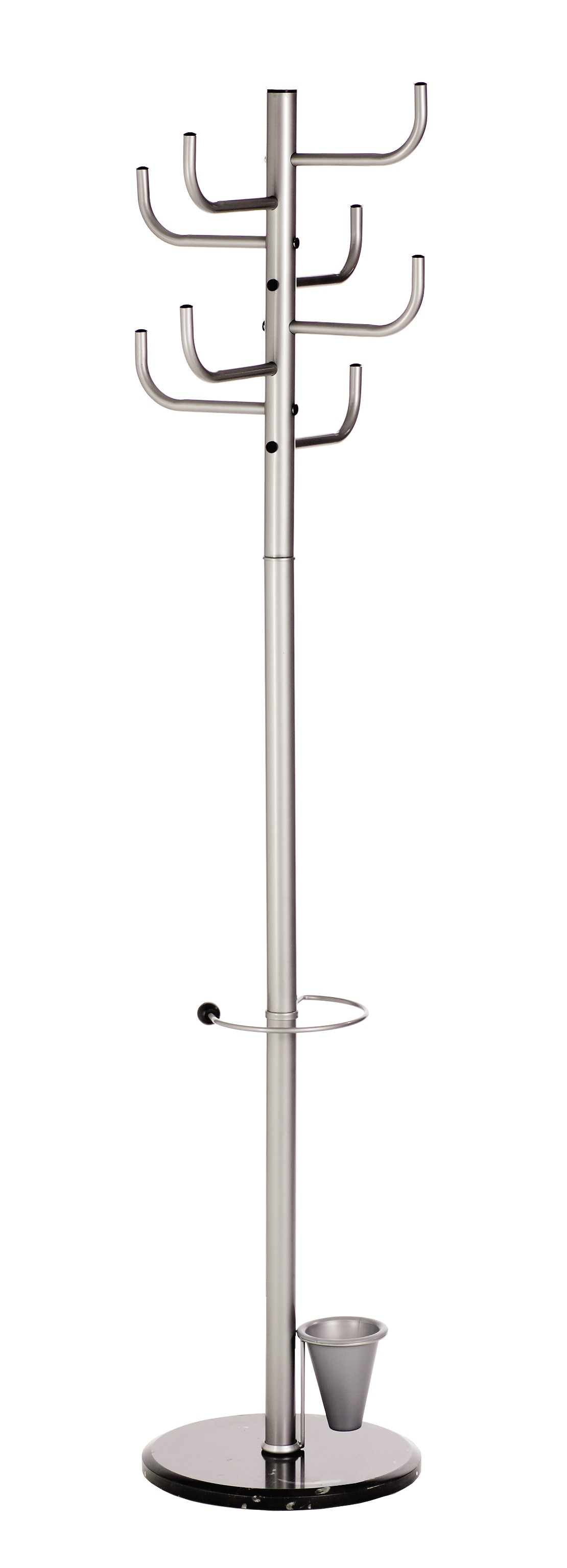 Robustan čiviluk sa teškom osnovom za visoku stabilnost. Sadrži i držač za kišobran. 8 kukica za kačenje.Visina 172 cm, prečnik osnove 40 cm.