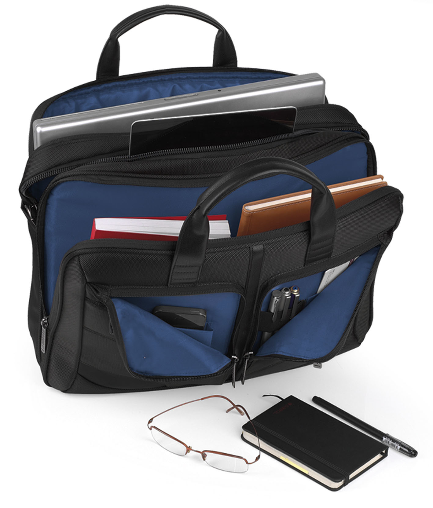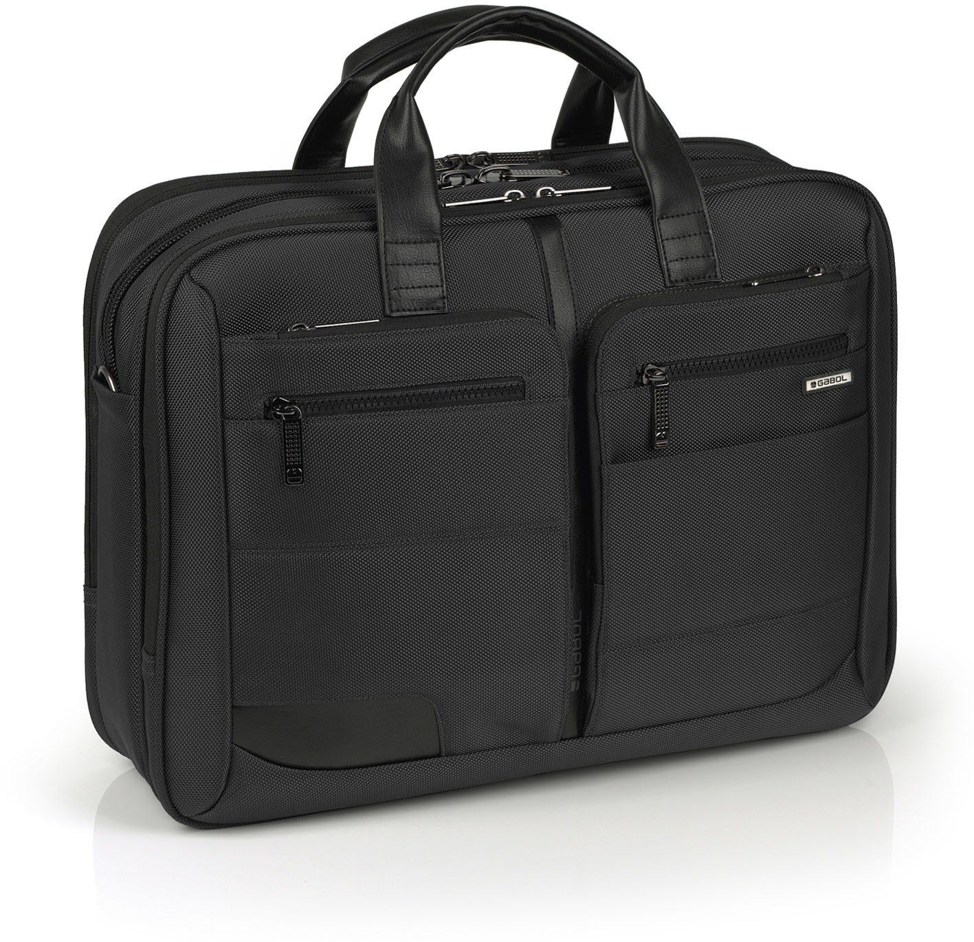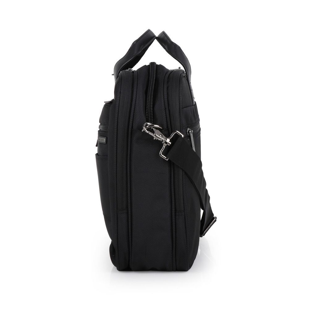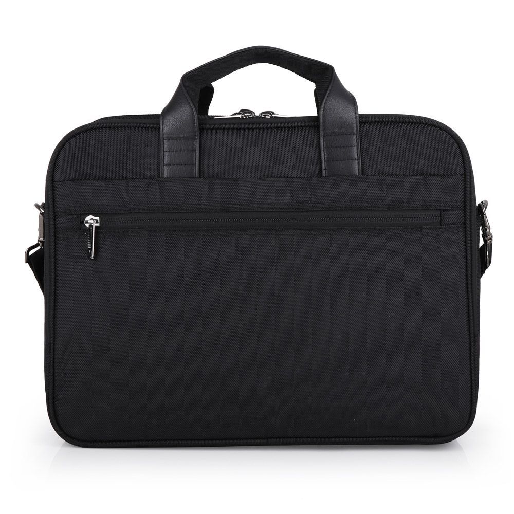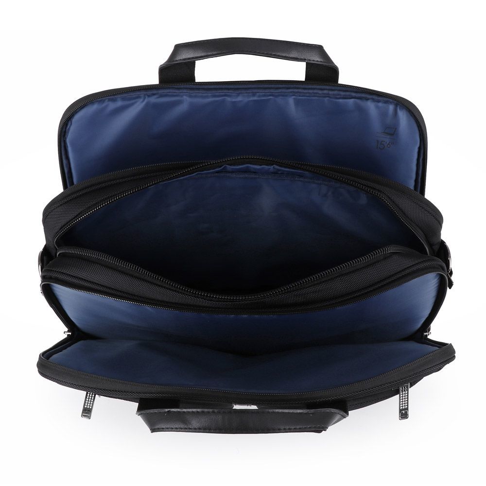 Tekstilna poslovna torba sa detaljima od veštačke kože. Sadrži tri odeljka, uključujući i deo za prenosni računar 15,6 kao i odeljak za tablet veličine 12,9"" Moguće kačenje na ručku kofera. Dimenzije: 42x31x12 cm.