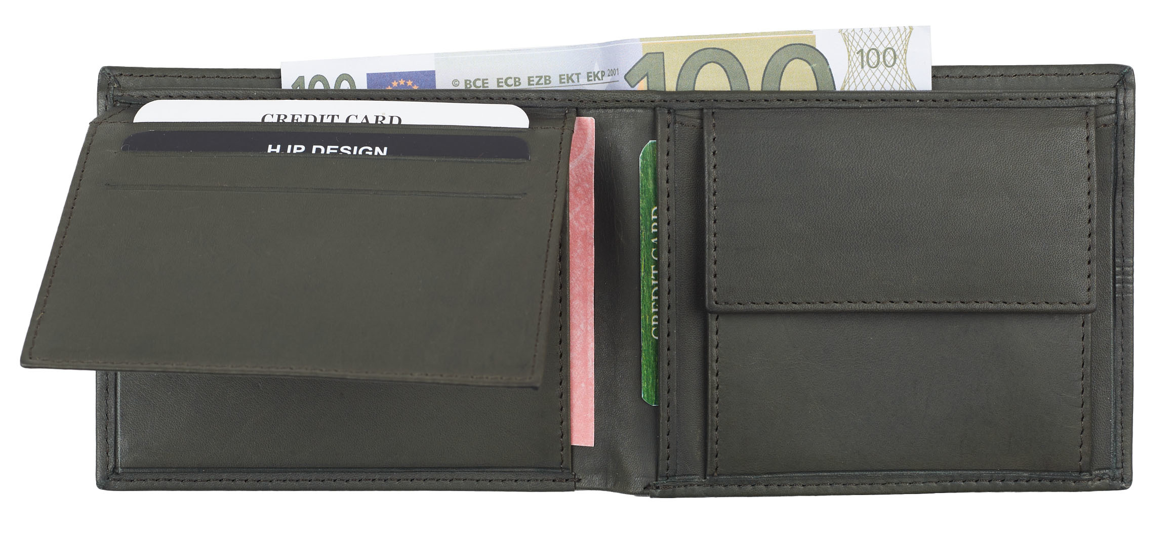 Klasičan muški preklopni kožni novčanik, sa interesantnom ranflom od linija po sredini. Pored glavne pregrade za novac, poseduje pregradu za sitan novac i pregrade za kartice i lična dokumenta, položena orijentacija.