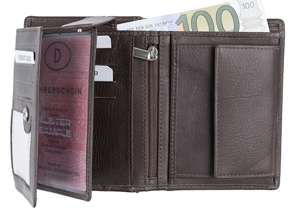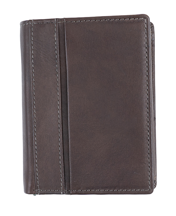 Klasičan muški preklopni kožni novčanik sa RFID zaštitom. Pored glavne pregrade za novac, poseduje pregradu za sitan novac i pregrade za kartice i lična dokumenta, kao i džepić koji se zatvara mini rajsferšlusom. Uspravna orijentacija.