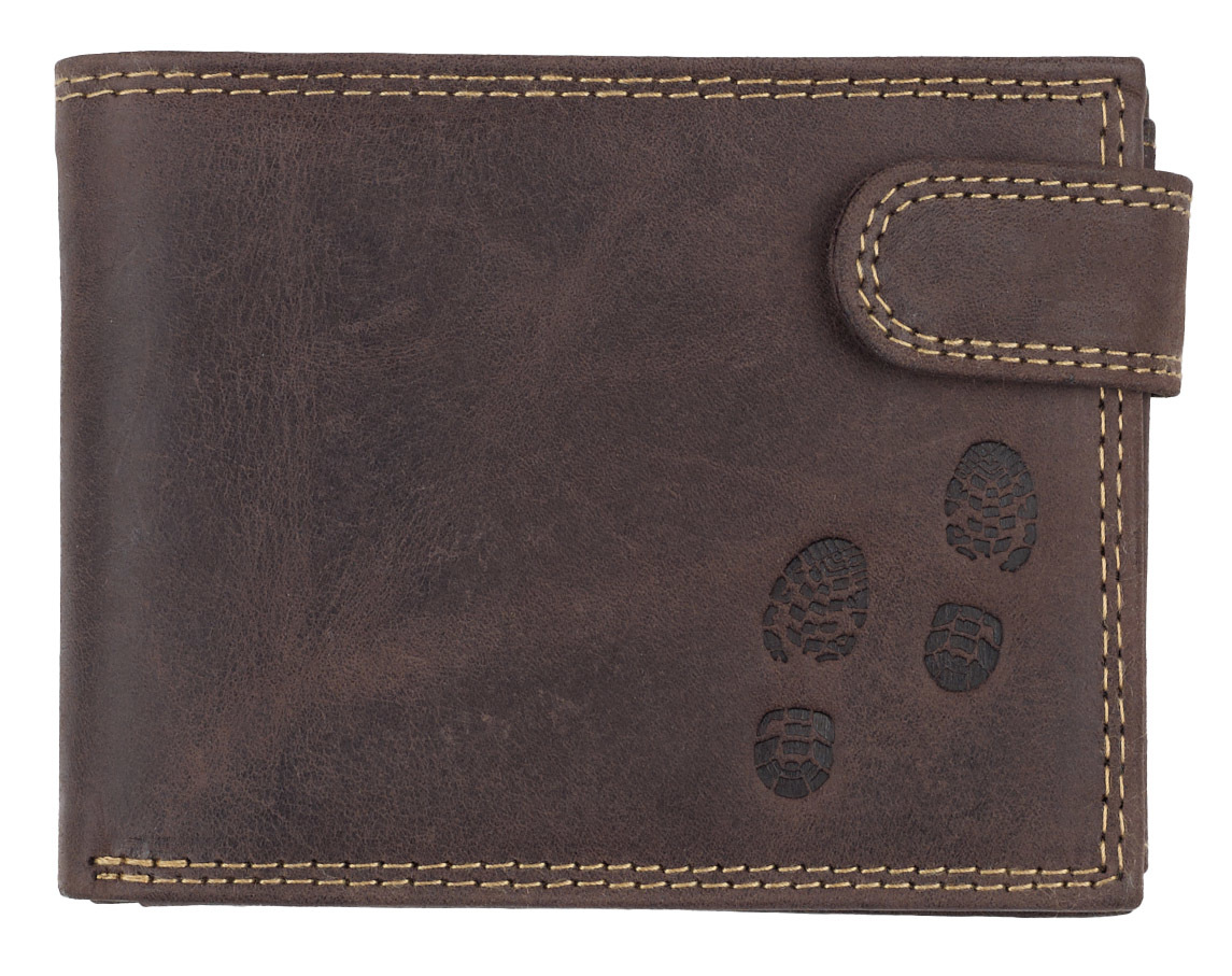 Klasičan muški preklopni novčanik od brušene kože sa RFID zaštitom, interesantnog dizajna, sa utisnutim otiskom čizama. Pored glavne pregrade za novac, poseduje pregradu za sitan novac i pregrade za kartice i lična dokumenta.Položena orijentacija.
