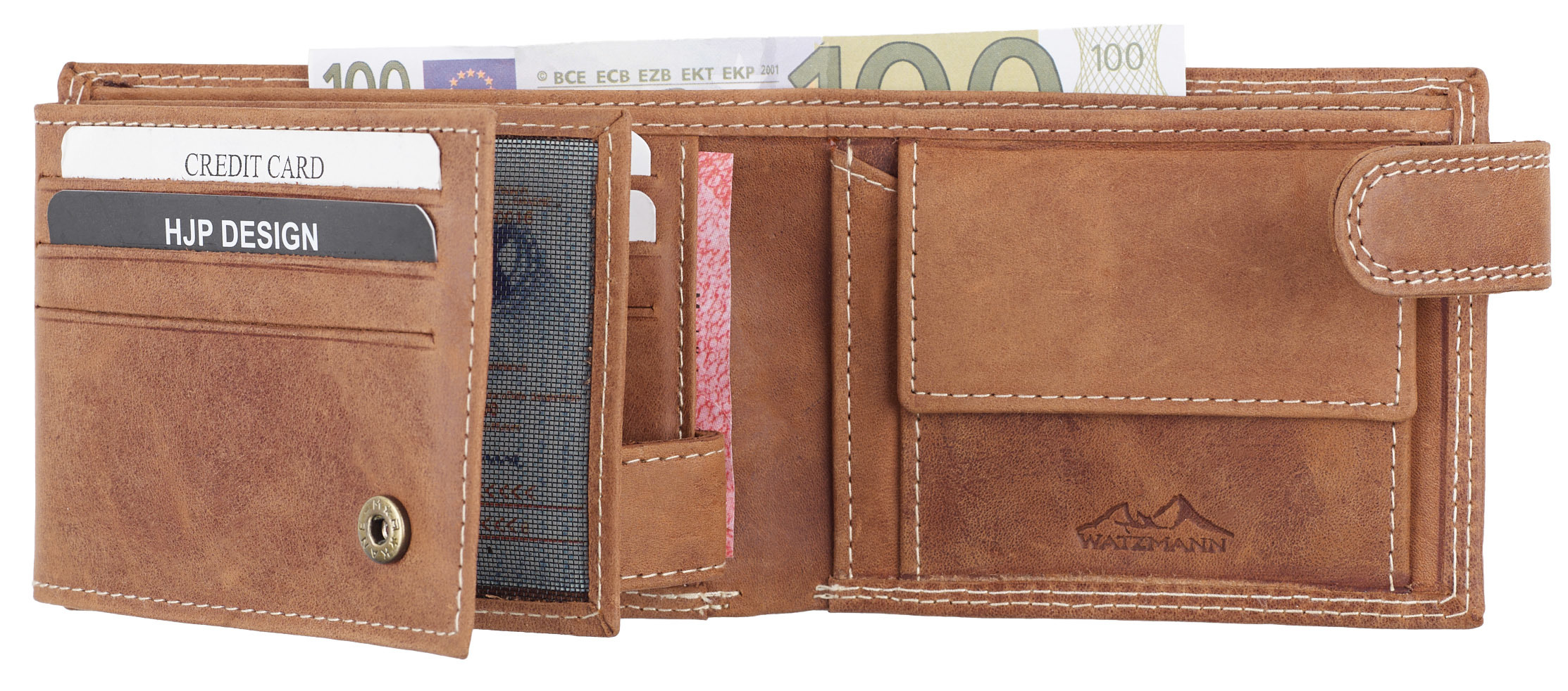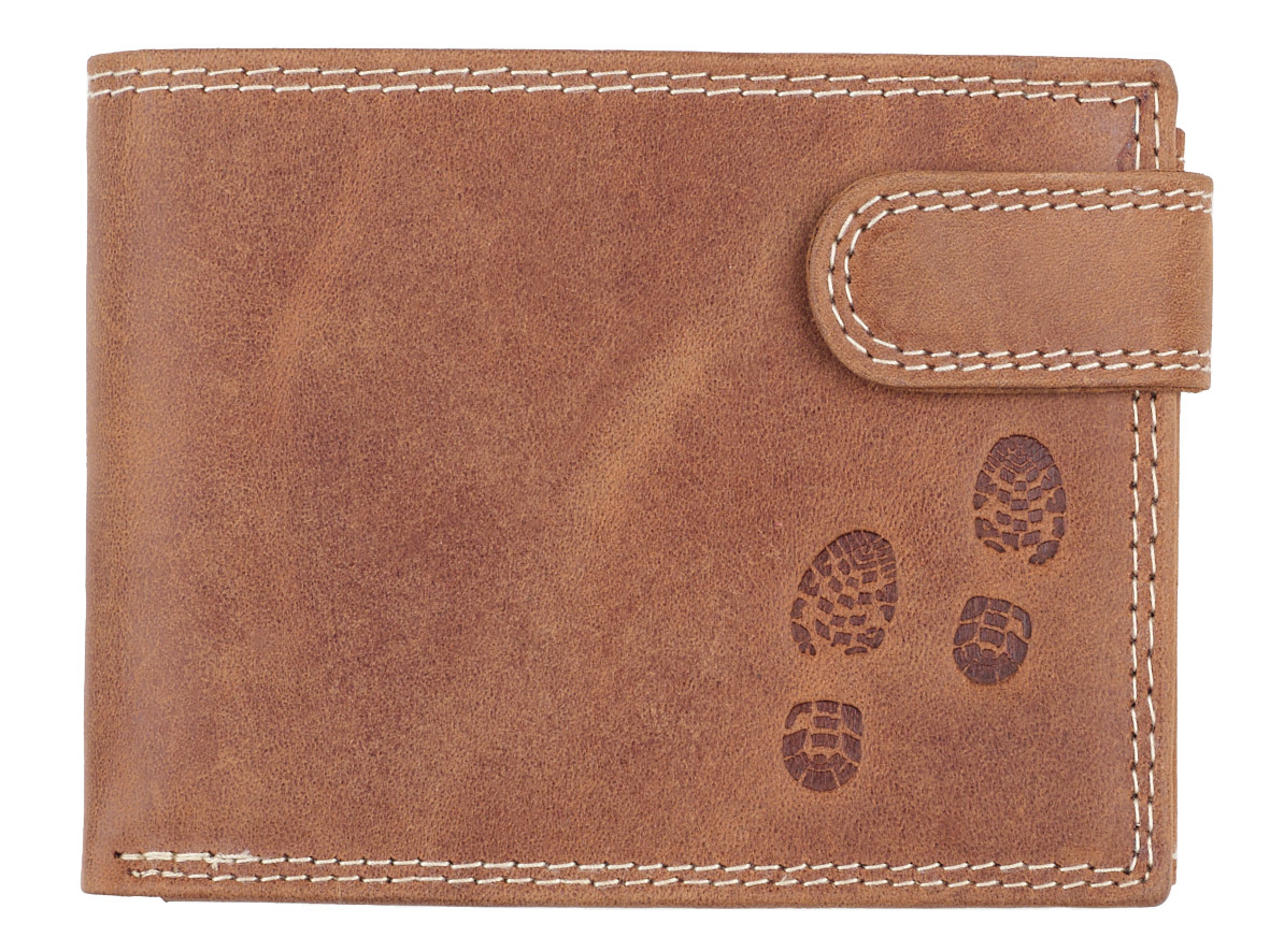 Klasičan muški preklopni novčanik od brušene kože sa RFID zaštitom, interesantnog dizajna, sa utisnutim otiskom čizama. Pored glavne pregrade za novac, poseduje pregradu za sitan novac i pregrade za kartice i lična dokumenta.Položena orijentacija.