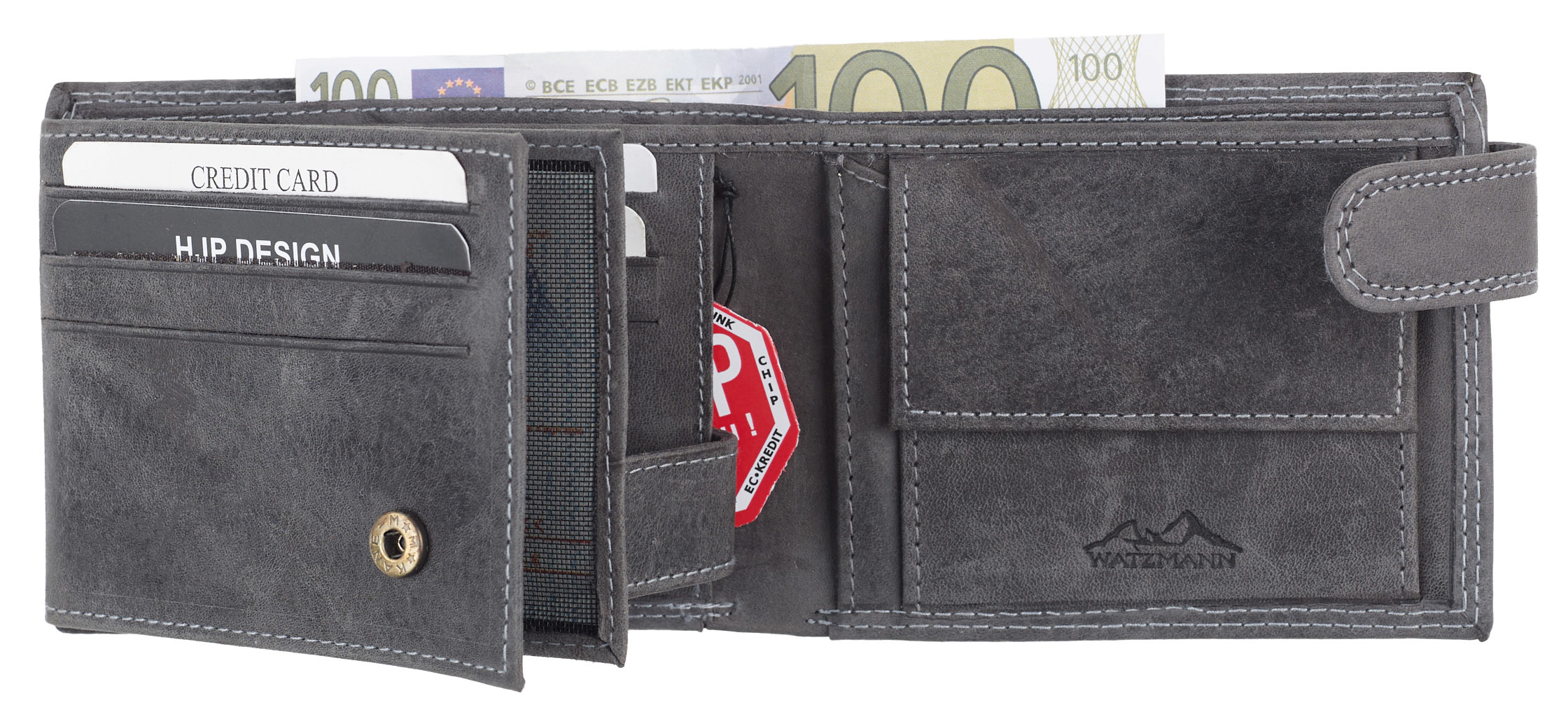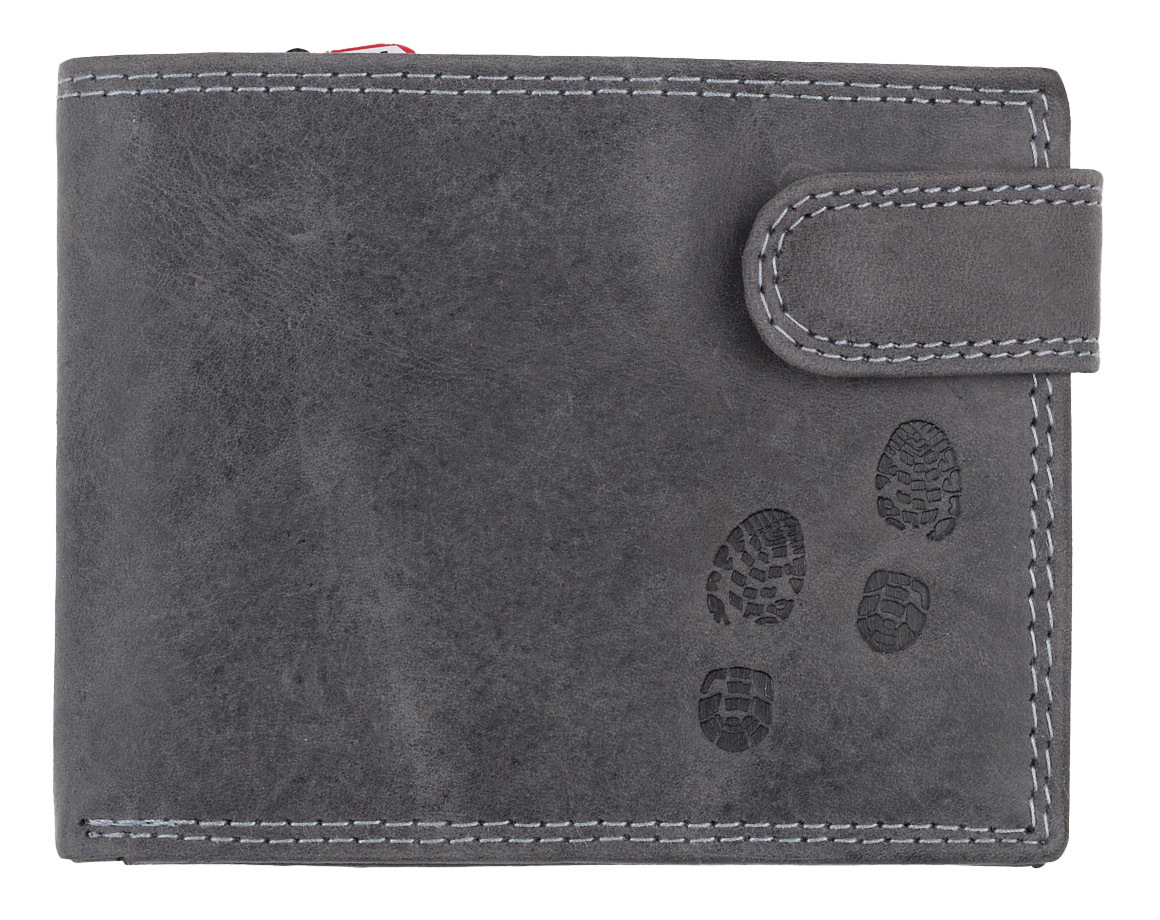 Klasičan muški preklopni novčanik od brušene kože sa RFID zaštitom, interesantnog dizajna, sa utisnutim otiskom čizama. Pored glavne pregrade za novac, poseduje pregradu za sitan novac i pregrade za kartice i lična dokumenta.Položena orijentacija.