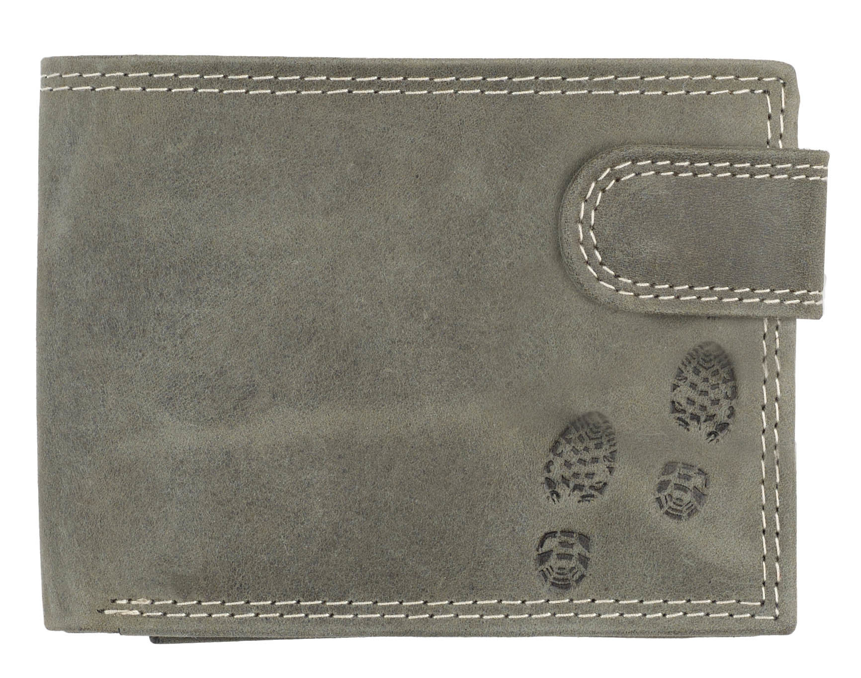 Klasičan muški preklopni novčanik od brušene kože sa RFID zaštitom, interesantnog dizajna, sa utisnutim otiskom čizama. Pored glavne pregrade za novac, poseduje pregradu za sitan novac i pregrade za kartice i lična dokumenta.Položena orijentacija.