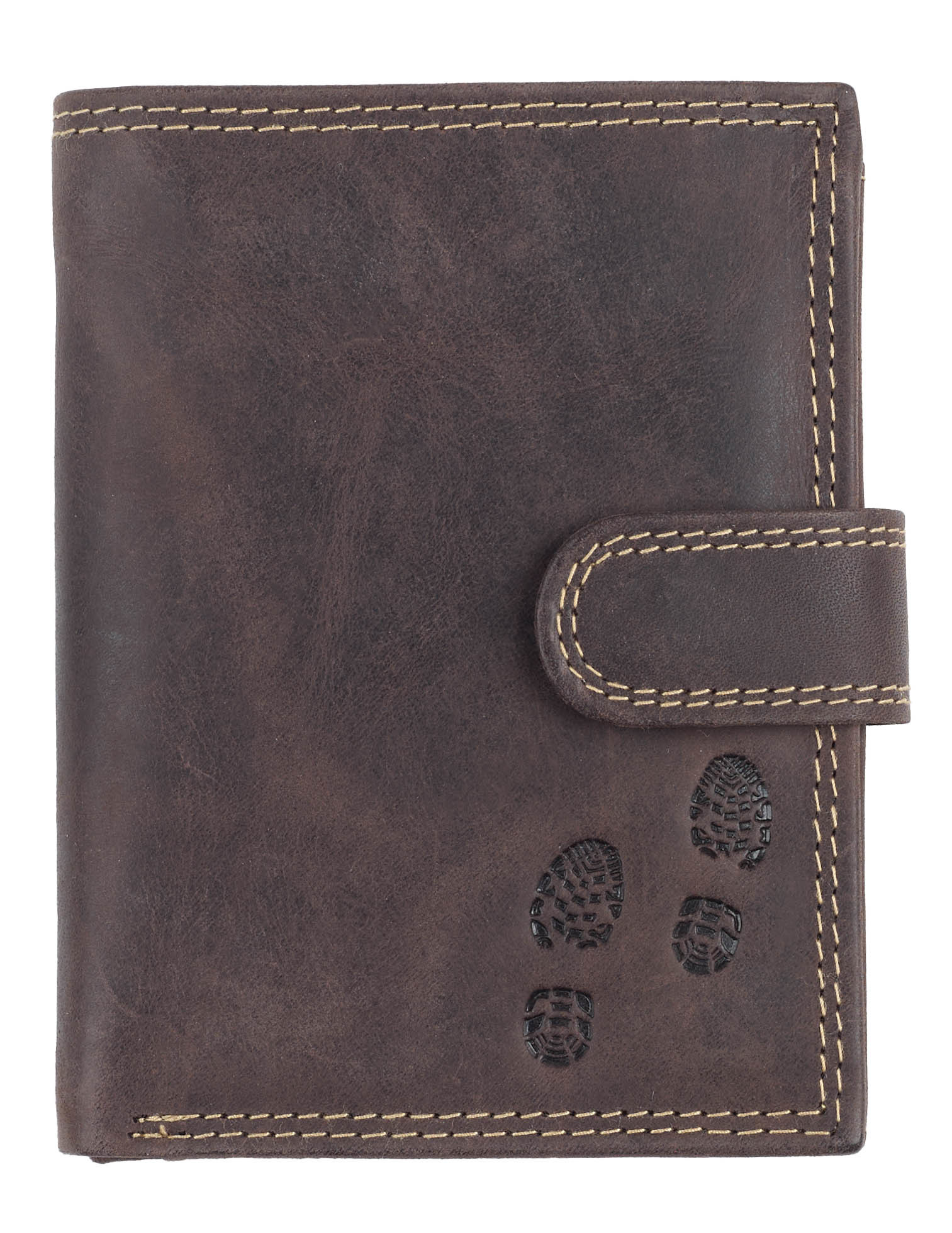 Klasičan muški preklopni novčanik od brušene kože sa RFID zaštitom, interesantnog dizajna, sa utisnutim otiskom čizama. Pored glavne pregrade za novac, poseduje pregradu za sitan novac i pregrade za kartice i lična dokumenta. Uspravna orijentacija.