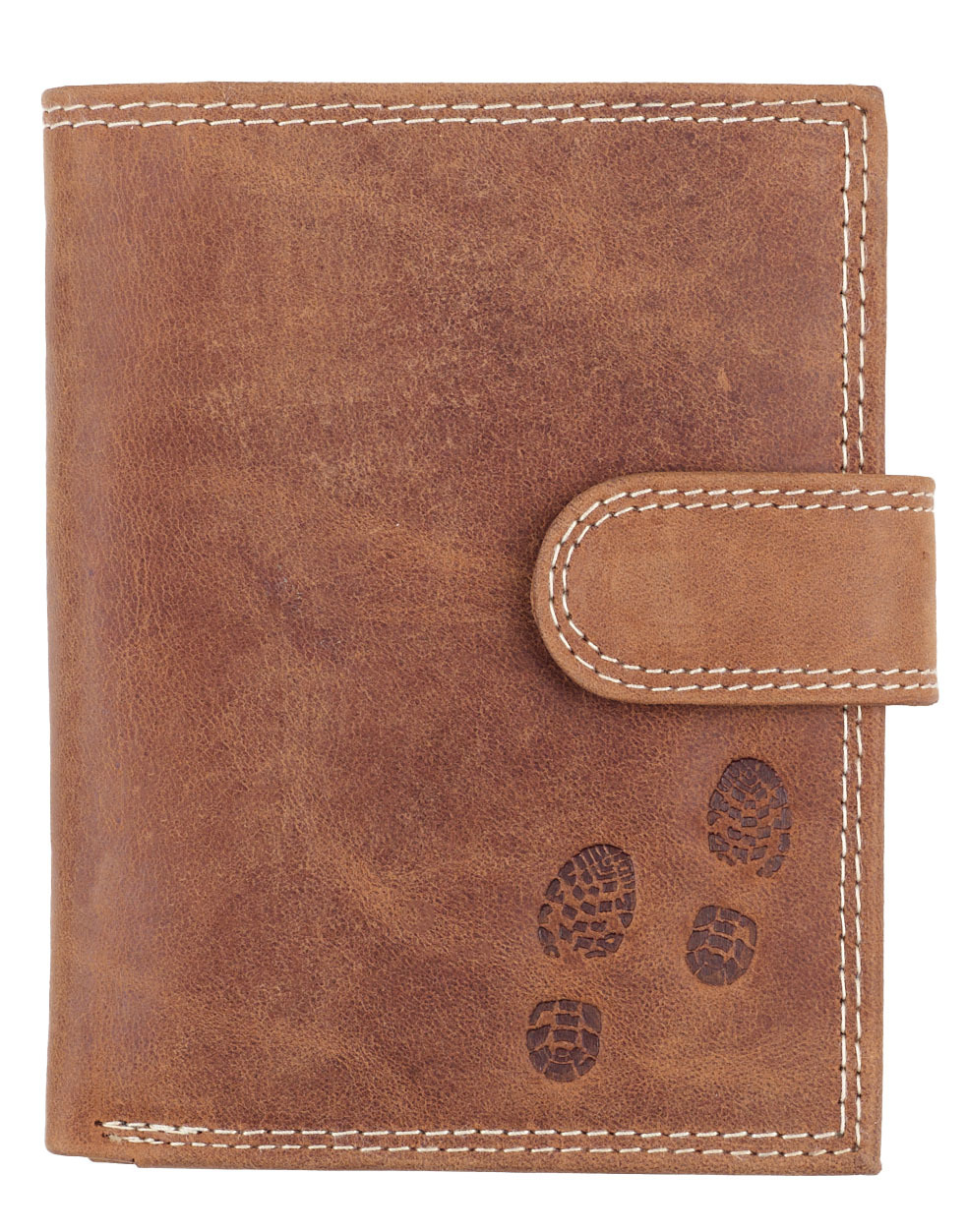 Klasičan muški preklopni novčanik od brušene kože sa RFID zaštitom, interesantnog dizajna, sa utisnutim otiskom čizama. Pored glavne pregrade za novac, poseduje pregradu za sitan novac i pregrade za kartice i lična dokumenta. Uspravna orijentacija.