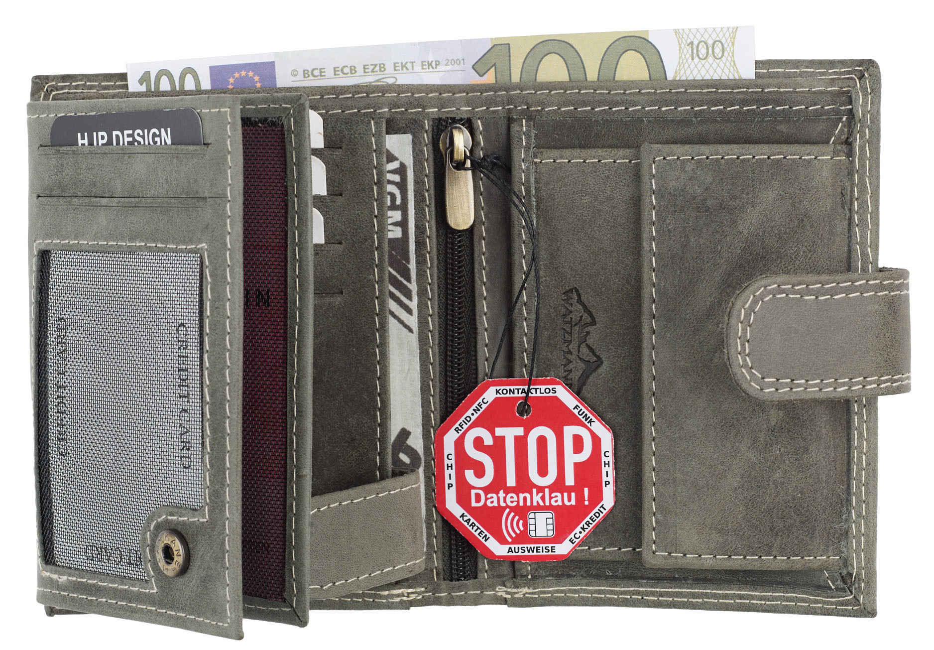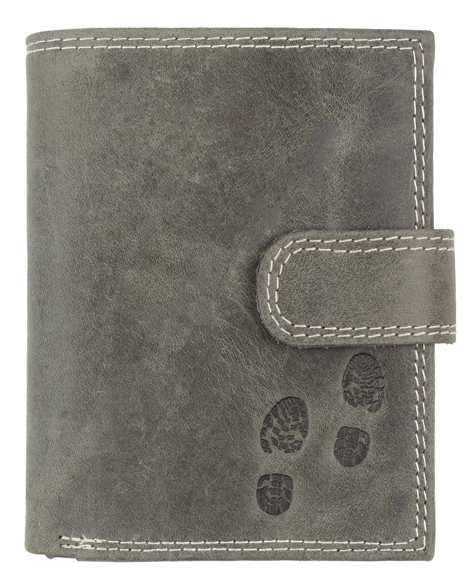 Klasičan muški preklopni novčanik od brušene kože sa RFID zaštitom, interesantnog dizajna, sa utisnutim otiskom čizama. Pored glavne pregrade za novac, poseduje pregradu za sitan novac i pregrade za kartice i lična dokumenta. Uspravna orijentacija.
