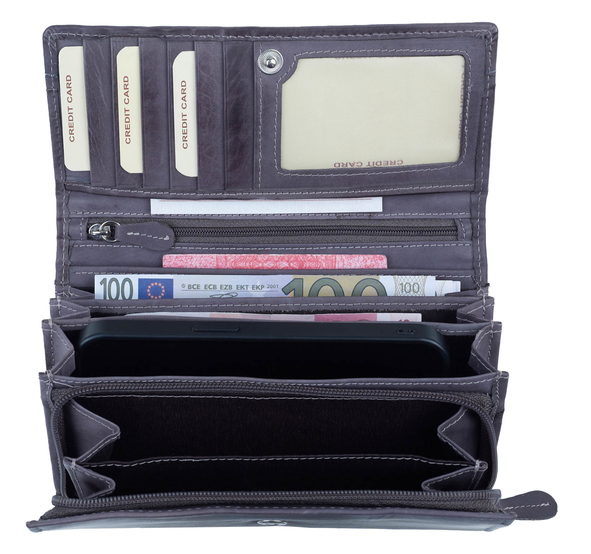 Veiki kožni ženski novčanik sa RFID zaštitom. Vintage dizajna. Poseduje jednu glavnu pregradu za novac, kao i pregrade za odlaganje kartica i ličnih dokumenata.