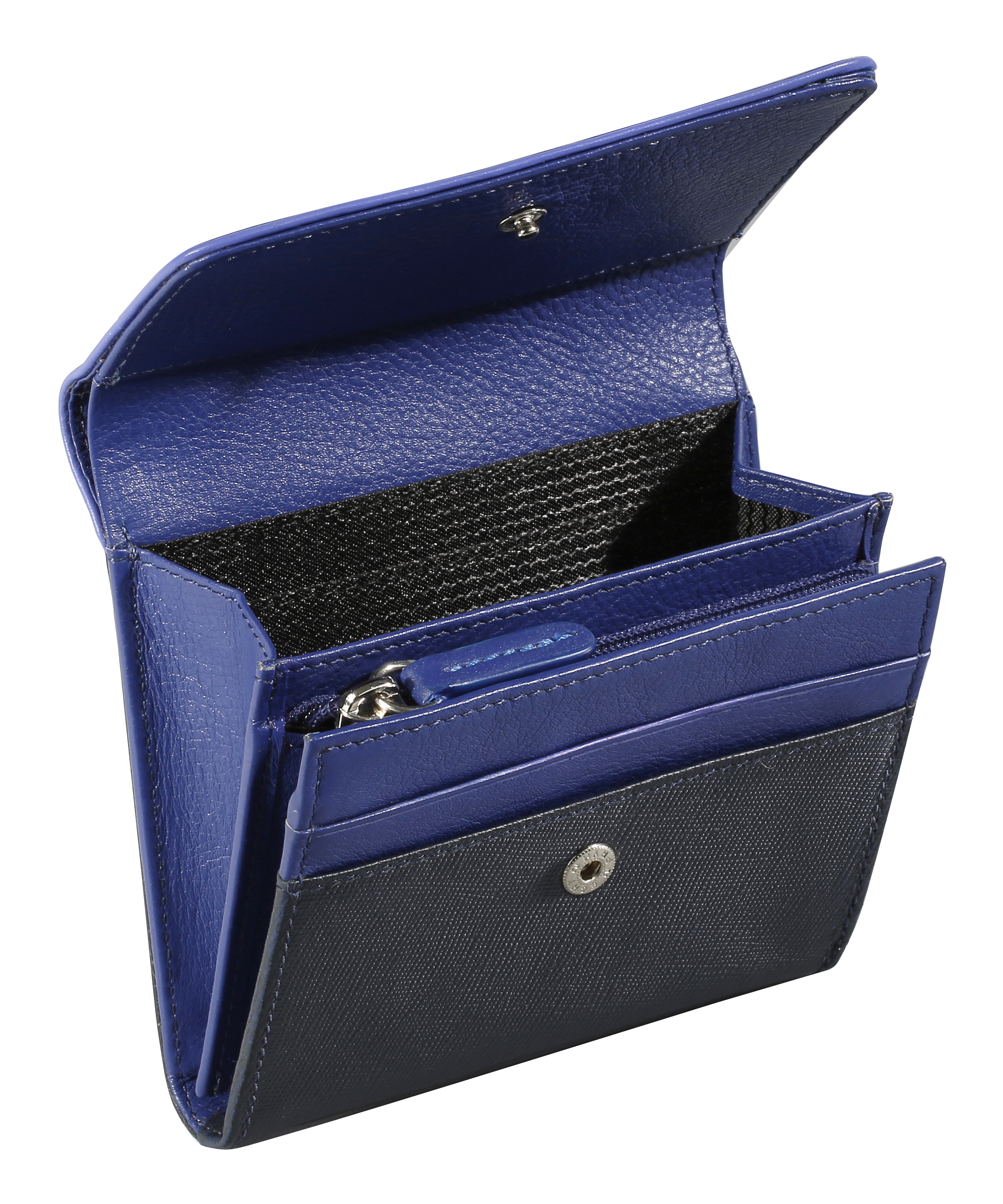 Veoma kompaktan ženski kožni novčanik asimetričnog dizajna, dvobojan, sa nekoliko pregrada za novac i lične dokumente, uključujući i zip pregradu za sitan novac. Dimenzije: 113x95x30 mm.