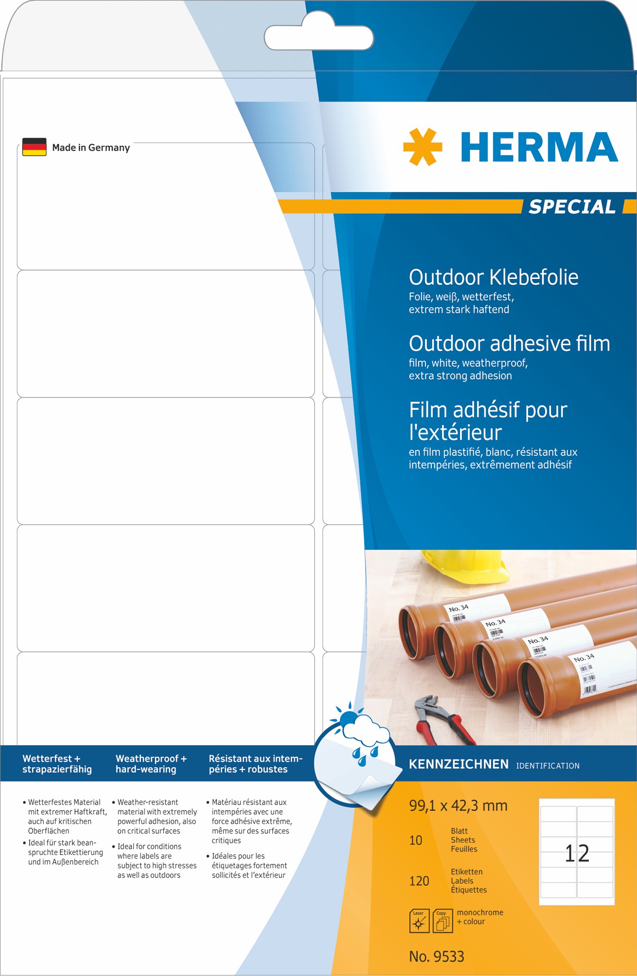 Etikete otporne na vremenske uslove od belog, mat polietilenskog filma, samolepljive. Idealno za spoljašnju primenu i često korišćeno obeležavanje: etikete imovine, nalepnice za izloge, informacije i znakovi upozorenja, oznake u skladištima i proizvodnim objektima. Izuzetno jake, otporne na vremenske uslove, otporne na starenje, otporne na ulje i prljavštinu, perive, otporne na temperaturu od -40 do +150 ° C, kao i na morsku vodu. Za laserske štampače, fotokopir aparate, laserske štampače u boji i fotokopir mašine u boji. Besplatna softverska rešenja: vvv.herma.de/softvare.