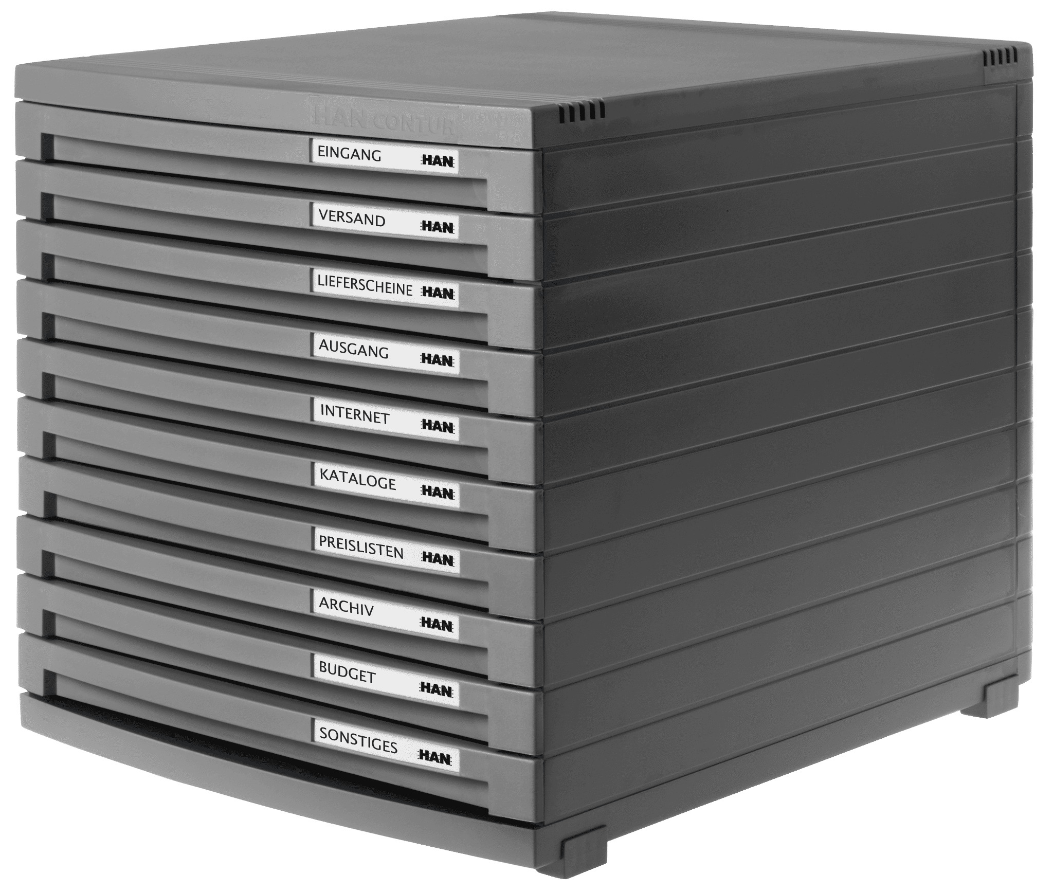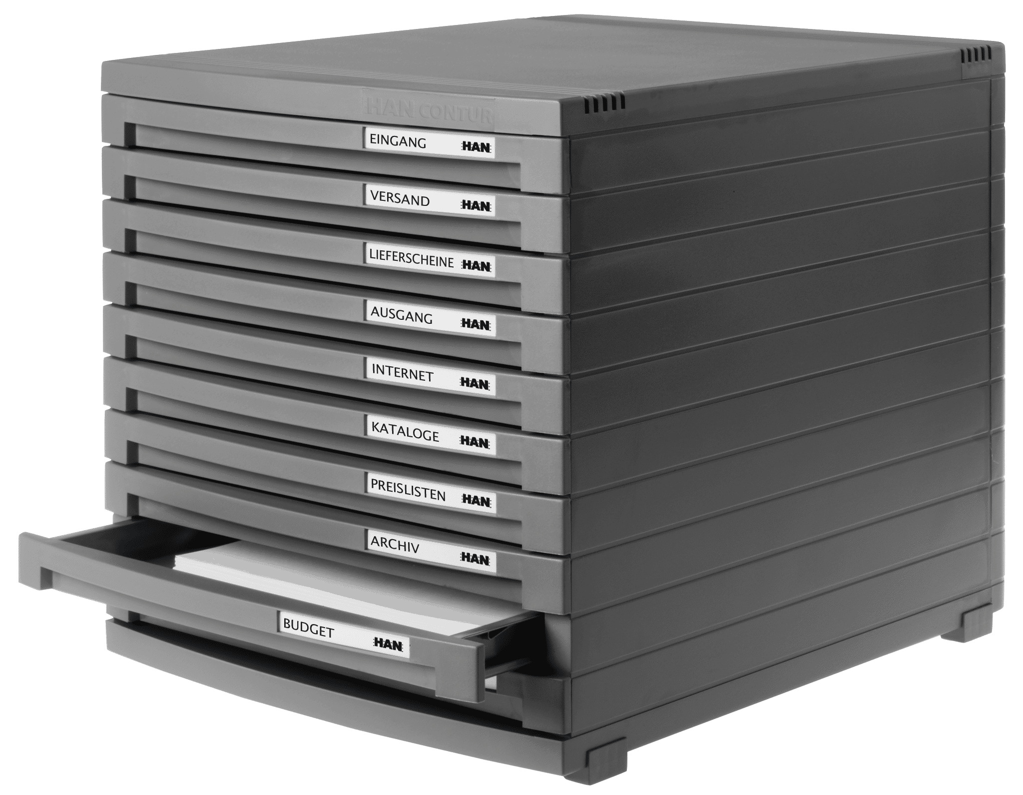 CONTUR poseduje 10 zatvorenih fioka koje podržavaju formate DIN A4/B4/C4 i idealno je rešenje za organizaciju manjih predmeta. Fioke imaju integrisane prostore za obeležavanje. Zahvaljujući inovativnoj i patentiranoj priključnoj vezi, bilo koji broj elemenata može se pojedinačno kombinovati kako bi se formiralo organizaciono rešenje. Izrađena je od visokokvalitetne plastike (polistiren PS) i zagarantovana je ogromna stabilnost. Dimenzije fioke: 254x355x20 mm. Dimenzije cele police: 300x382x307 mm.
