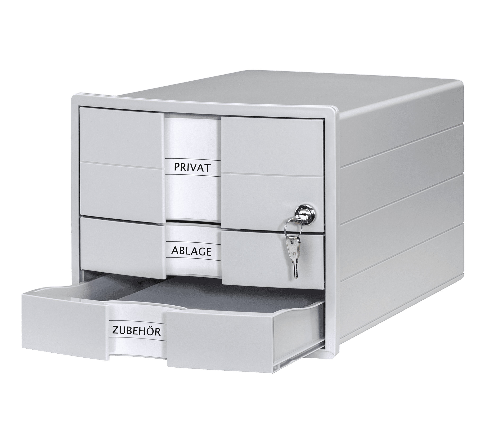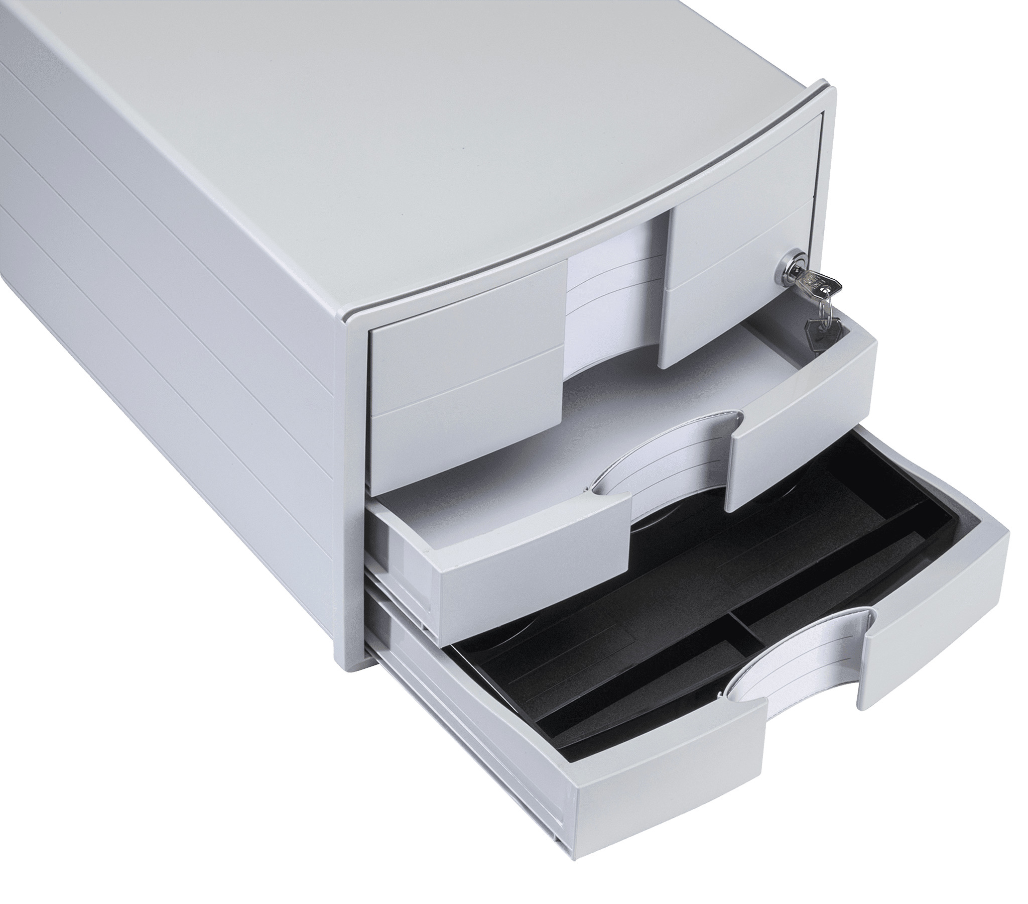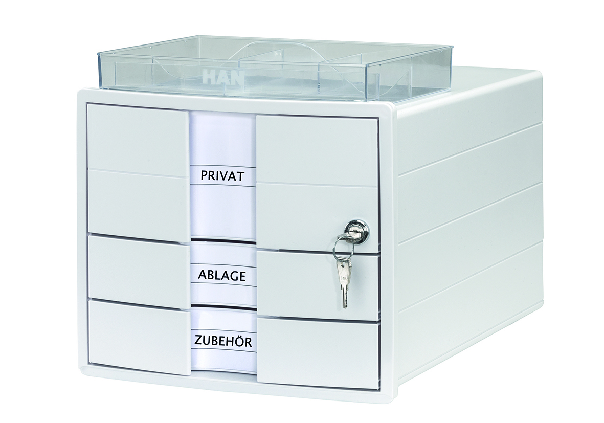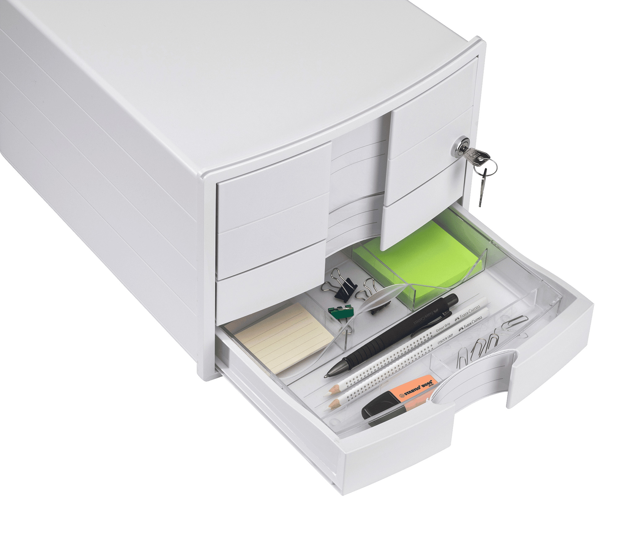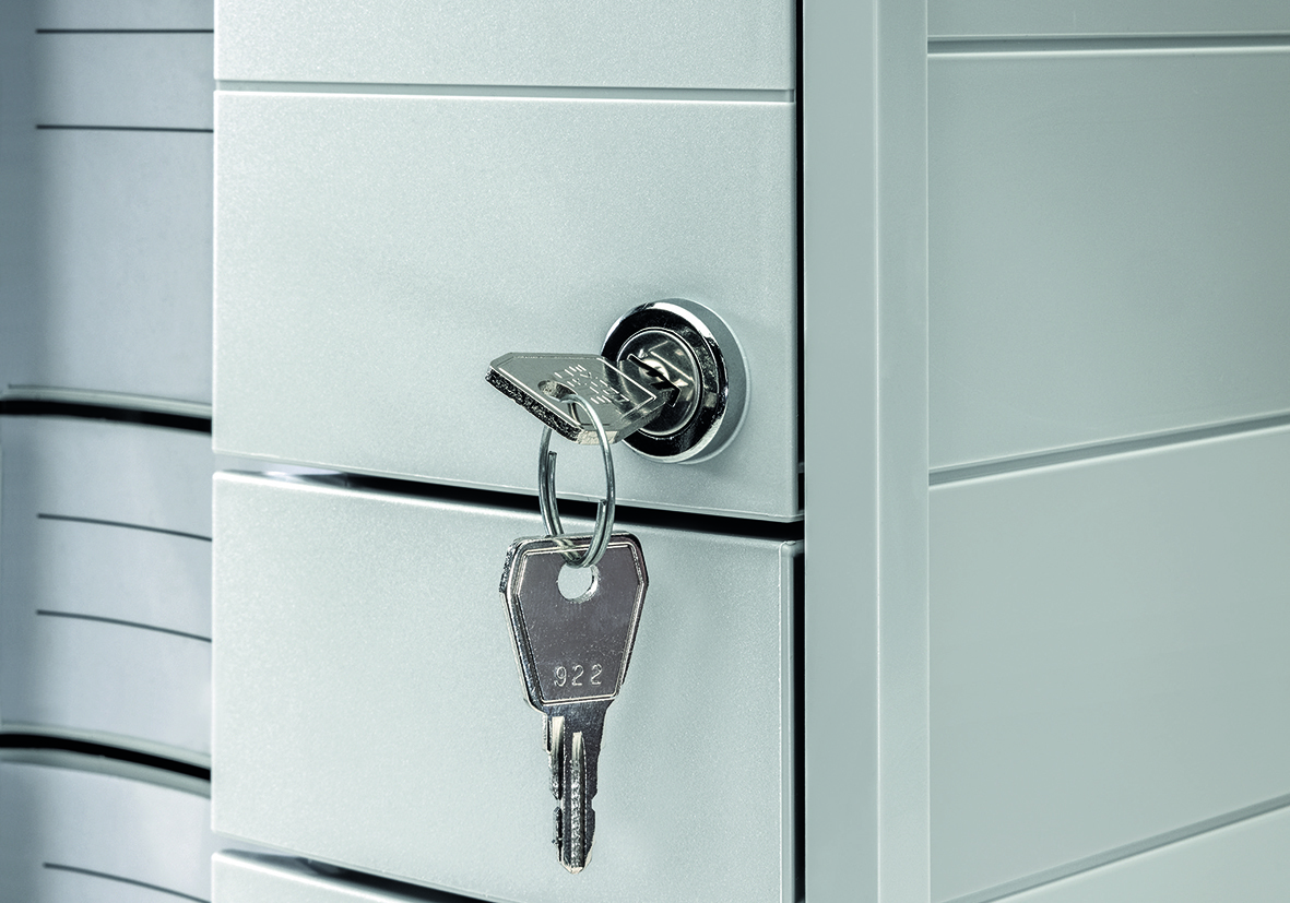 Gornja fioka je duple dubine i može se zaključati pomoću metalne bravice sa dva ključa. Uključen je i praktičan uložak za organizaciju koji se može koristiti u fiokama ili fiksirati na vrhu police.