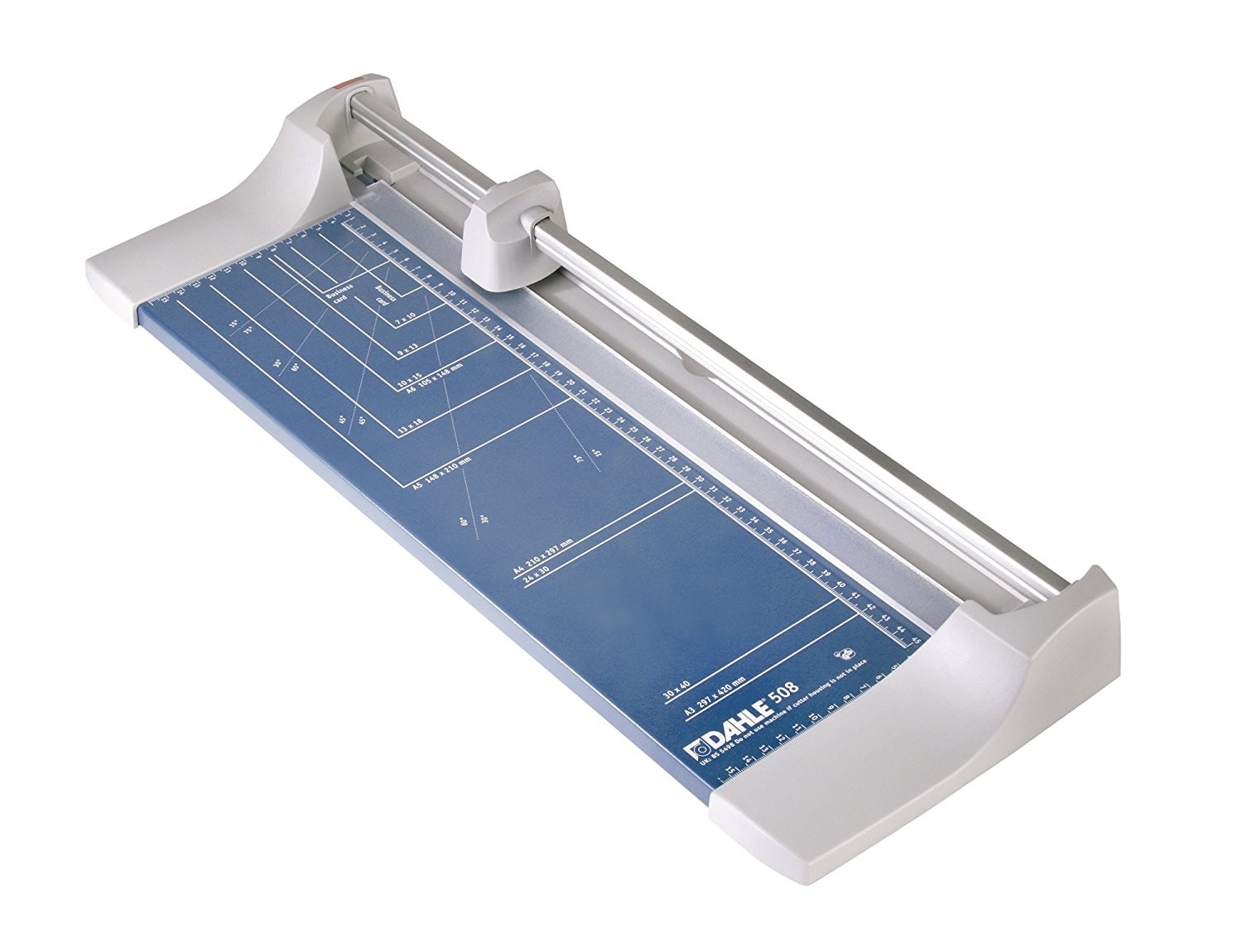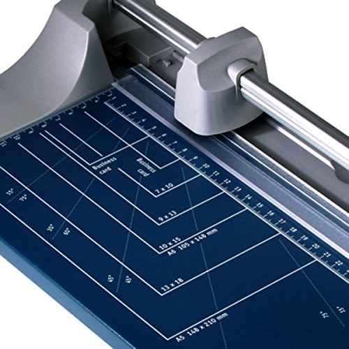 Metalna radna površina sa oznakama formata i oznake u centimetrima. Pritiskom na nož se ujedno fiksira materijal koji se seče. Opciono sa može montirati set sa tri noža za kreativno sečenje.