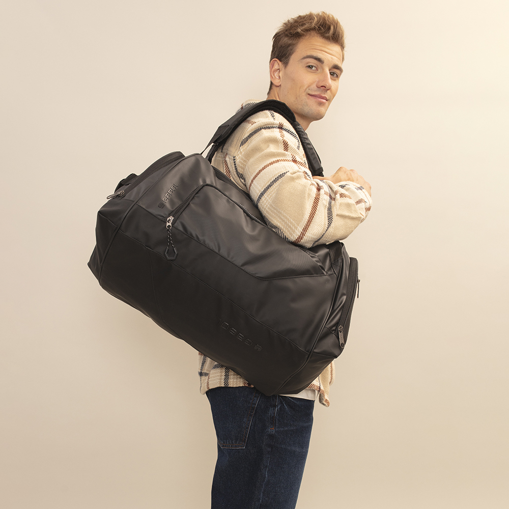 Komforna putna torba kapaciteta 41l, sa pregradom za obuću i dodatnim spoljnim džepovima za sitnice. Može se nositi u ruci ili na leđima, kao ranac. Dimenzije: 55x30x28 xm. Izrađena od kombinacije poliestera i veštačke kože.