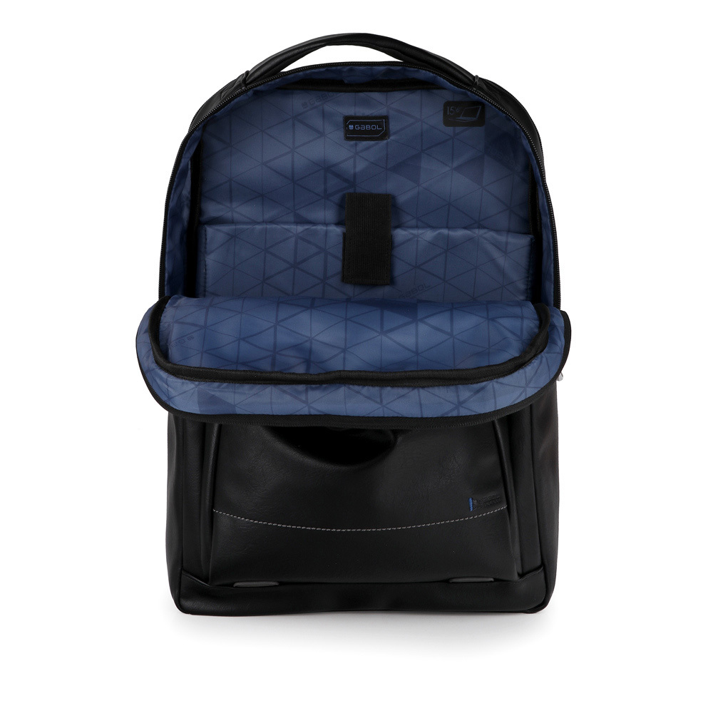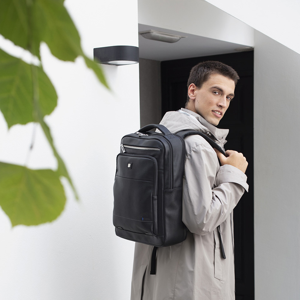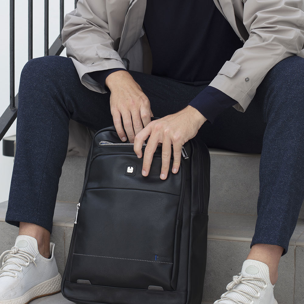 Poslovni ranac modernog dizajna koji u centralnom delu ima odeljke za notebook 15,6" i tablet 10". Sa prednje strane ima jednu malu i veliku pregradu u kojoj se nalazi manji odeljak za mobilni telefon. Ranac se može zakačiti na telekopsku ručku kofera radi lakšeg transporta.