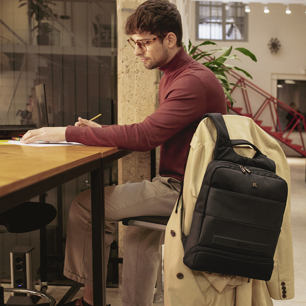 Ranac od sitetičkog vodootpornog materijala, veoma popularan, praktičan i uskladjen za svakodnevnu kombinaciju. Sa prednje strane ranca je pregrada koja se prostire celom dužinom. Glavna i najveća pregrada se otvara sa zadnje ranca, što pruža dodatnu sigrnost. Unutrašnjost sadrži dodatni džep, dok se u donjem delu ranaca nalazi dodatni zip, koji omogućava povećanje ranca, sve do dimenzije notebooka od 17" Dimenzije 31 x 40 x 8 cm/ proširen: 31 x 48 x 8 cm.