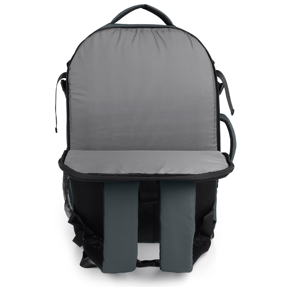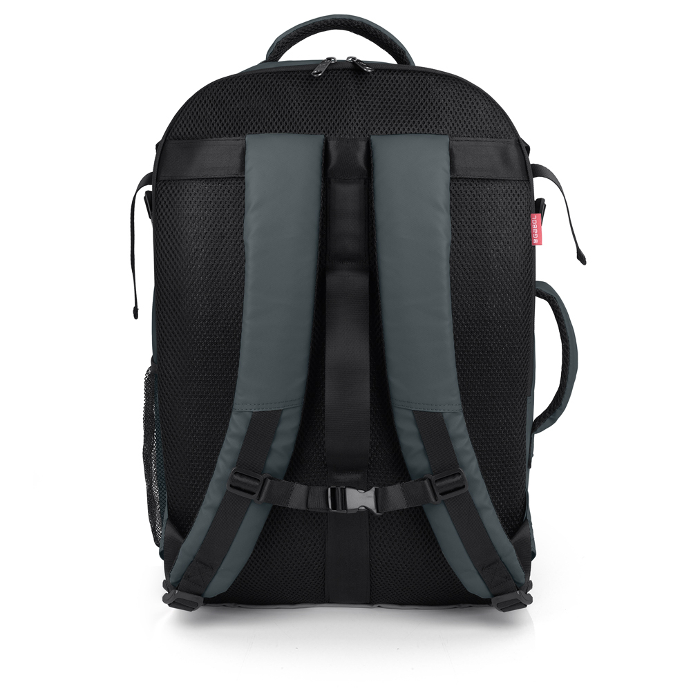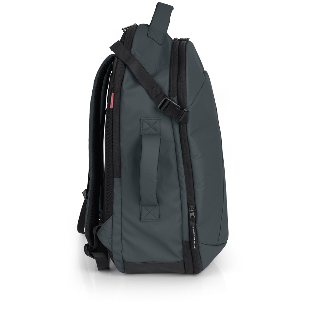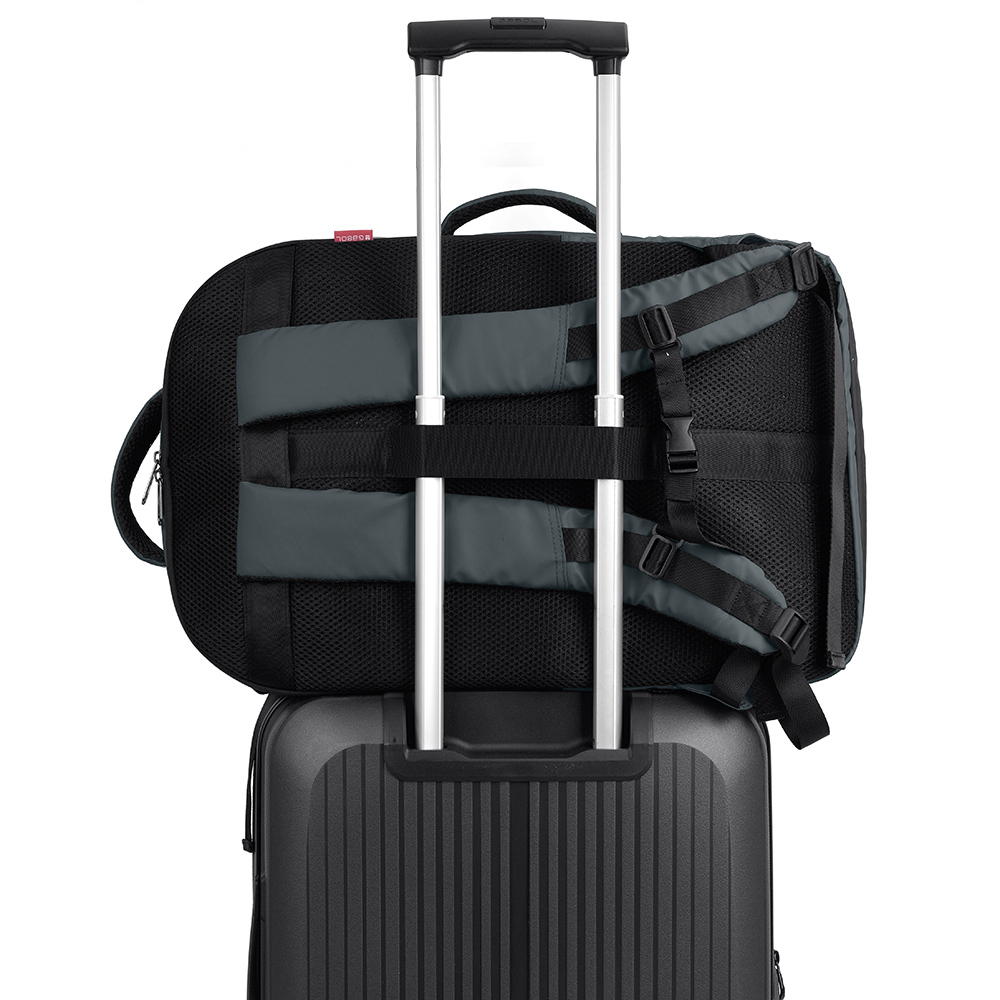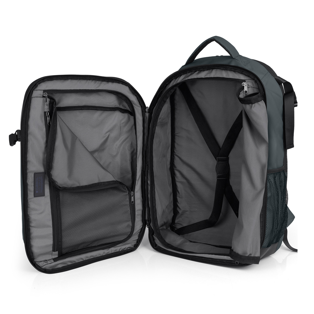 Ranac koji se pakuje i otvara kao kofer: ima dve pregrade koje se zatvaraju rajsferšlusom i mogućnost proširenja za čak 3cm, čime se između zatvorenih pregrada dobija vrlo solidan dodatni prostor. Zapreminom je između kabinskog i srednjeg kofera. Vrlo je udoban za nošenje. Dodatna pogodnost je što imate mekan komad prtljaga koji možete lakše spakovati u automobil, za razliku od kofera. Poseduje ručku za držanje sa strane, kao i strap trake koje ga dodatno ojačavaju i čiine kompaktnijim. Dimenzije: 35x55x18cm, sa mogućnošću dodatnog proširenja na 23cm. Materijal: kombinacija postavljenog poliestera i veštačke kože.